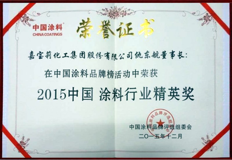 12月18日,2015中國水性工業涂料發展研討會在京召開。會議旨在順應國家系列環保法規,加快涂料行業的轉型升級。會議同期還舉辦了2015中國涂料品牌榜頒獎活動,嘉寶莉是獲獎最多的企業之一,先后被授予為2015“中國藝術涂料名牌獎”、“中國建筑涂料名牌獎”、“中國木器涂料名牌獎”、“中國防腐涂料名牌獎”,嘉寶莉董事長仇東航還榮獲了“2015中國涂料行業精英獎”。