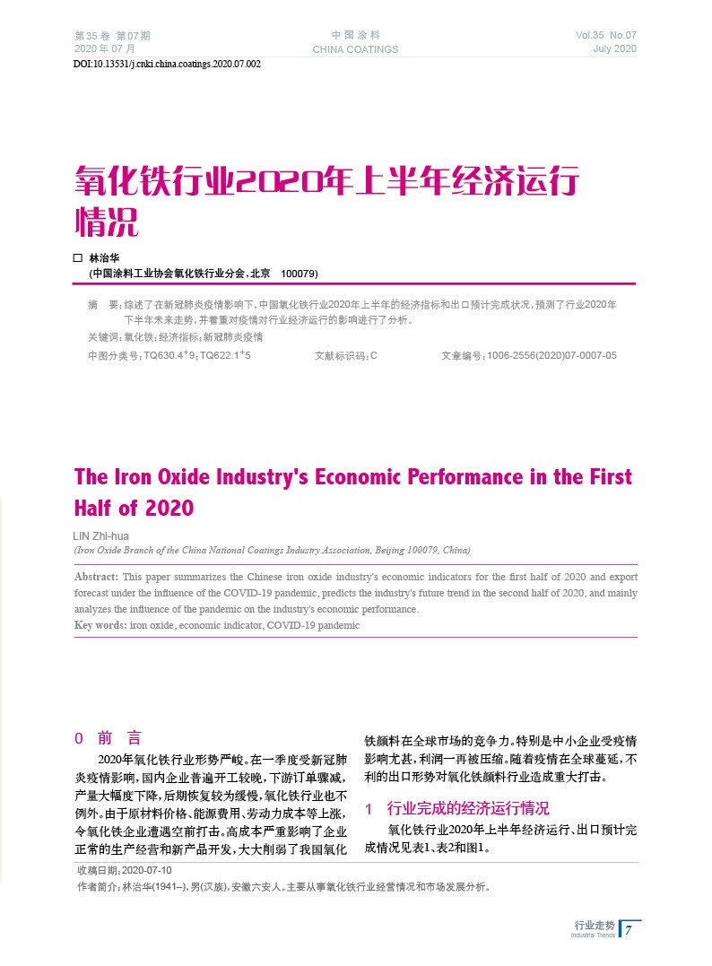 摘要:綜述了在新冠肺炎疫情影響下,中國氧化鐵行業(yè)2020年上半年的經(jīng)濟(jì)指標(biāo)和出口預(yù)計(jì)完成狀況,預(yù)測了行業(yè)2020年下半年未來走勢,并著重對疫情對行業(yè)經(jīng)濟(jì)運(yùn)行的影響進(jìn)行了分析。
