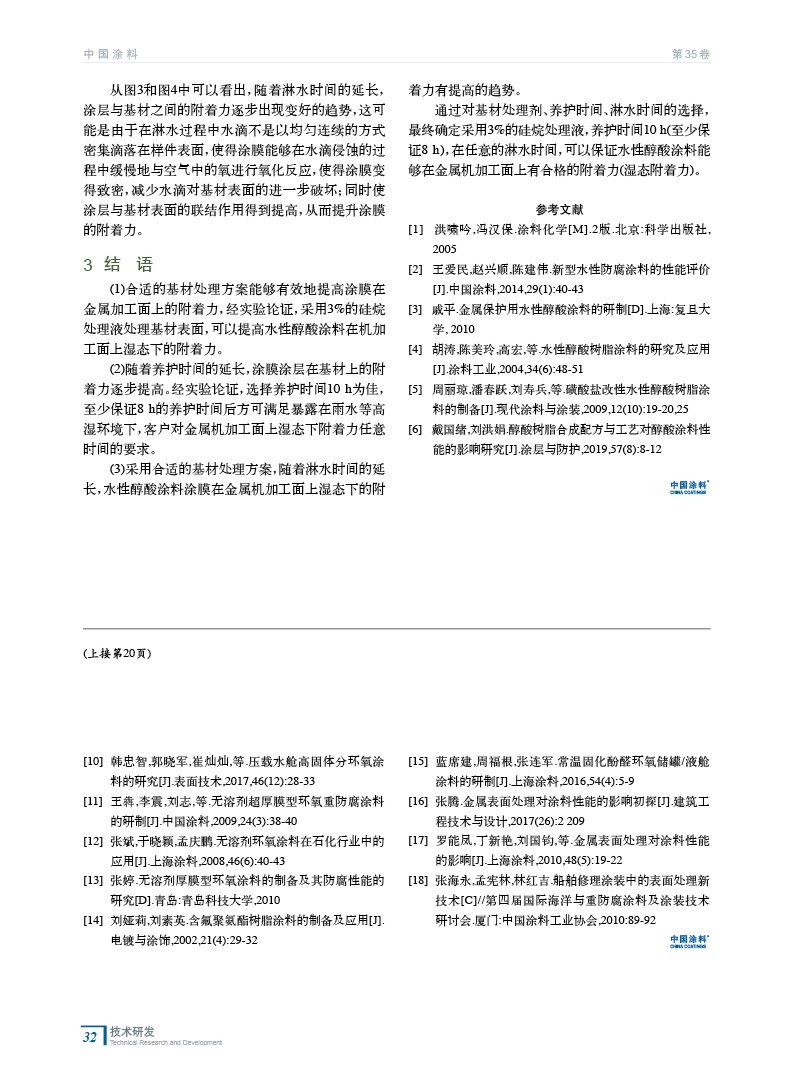 摘要:以自制的水性醇酸涂料為涂層,金屬機(jī)加工面為基材,討論了基材處理劑、養(yǎng)護(hù)時(shí)間、淋水時(shí)間對(duì)涂層在金屬加工面上濕態(tài)下附著力的影響。采用濃度為3%的硅烷處理液處理基材能夠有效地提高涂層在金屬加工面上的附著力;隨著養(yǎng)護(hù)時(shí)間和淋水時(shí)間的延長(zhǎng),能夠在一定程度上改善水性醇酸涂料在金屬加工面上的濕態(tài)附著力較差的現(xiàn)象。