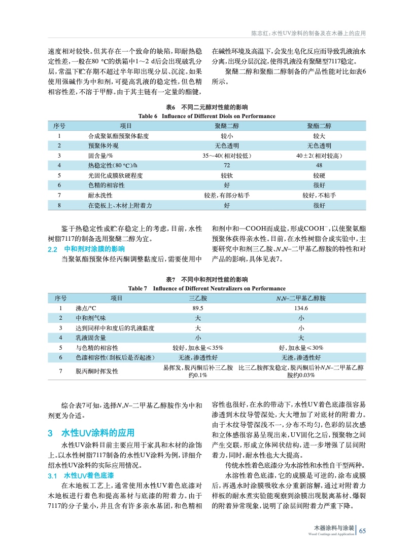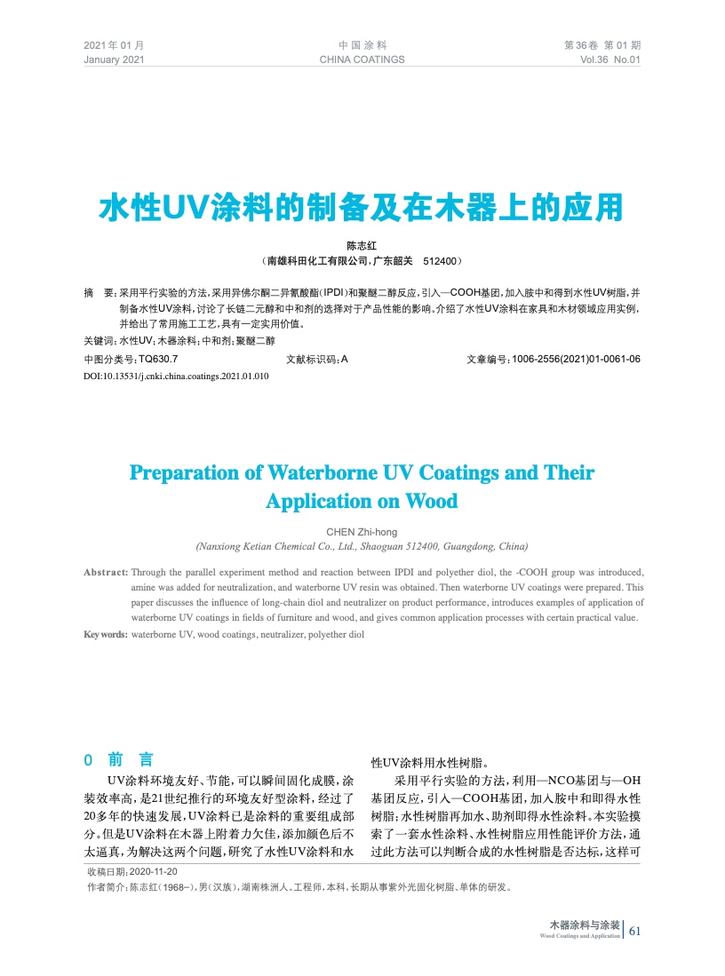 摘要:采用平行實(shí)驗(yàn)的方法,采用異佛爾酮二異氰酸酯(IPDI)和聚醚二醇反應(yīng),引入—COOH基團(tuán),加入胺中和得到水性UV樹(shù)脂,并制備水性UV涂料,討論了長(zhǎng)鏈二元醇和中和劑的選擇對(duì)于產(chǎn)品性能的影響。介紹了水性UV涂料在家具和木材領(lǐng)域應(yīng)用實(shí)例,并給出了常用施工工藝,具有一定實(shí)用價(jià)值。