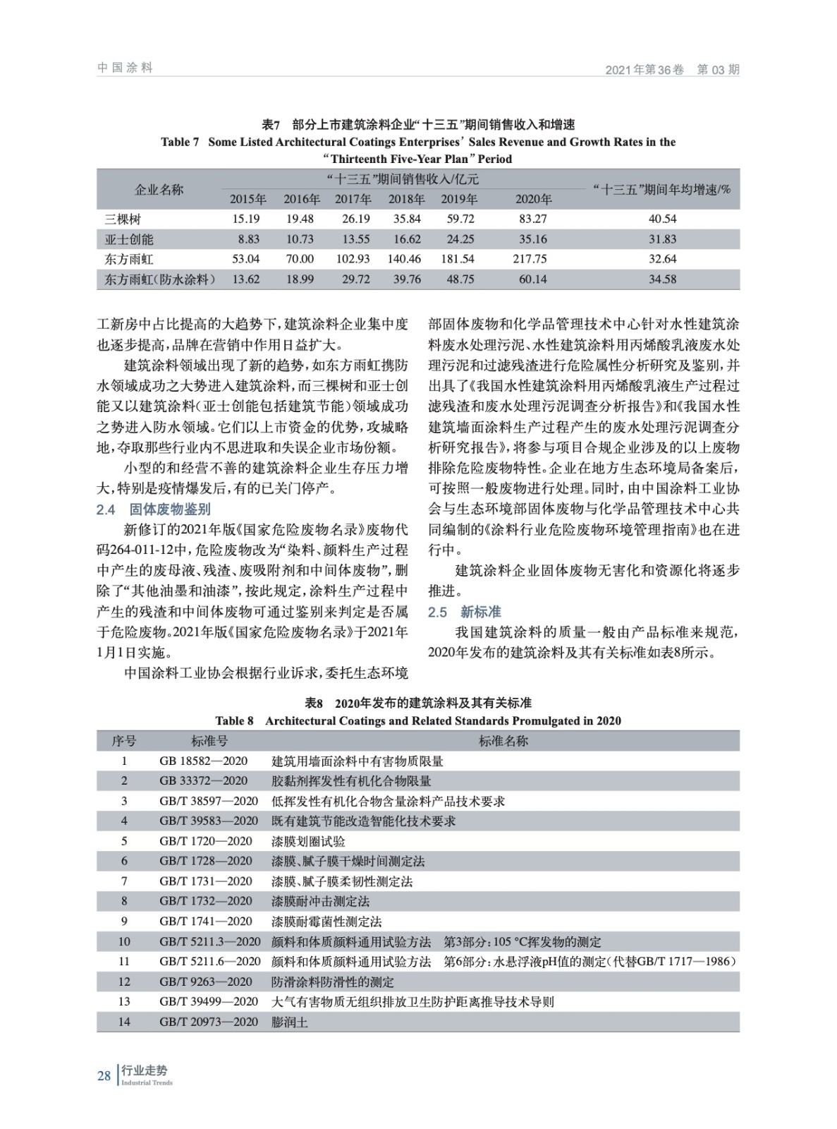 摘要:介紹了2020年我國(guó)建筑涂料的發(fā)展背景和動(dòng)力,從產(chǎn)量和銷(xiāo)售收入、產(chǎn)品創(chuàng)新、行業(yè)結(jié)構(gòu)調(diào)整、固體廢物鑒定、標(biāo)準(zhǔn)發(fā)布實(shí)施等方面總結(jié)了建筑涂料2020年現(xiàn)狀,并對(duì)2021年建筑涂料發(fā)展趨勢(shì)進(jìn)行了展望。