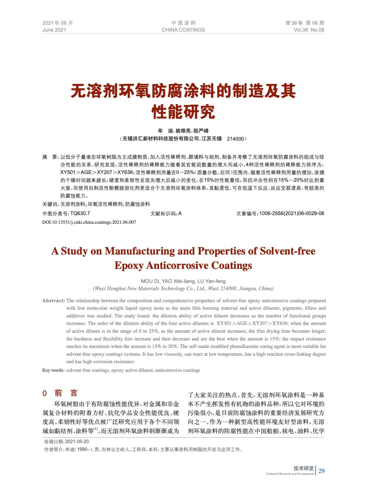 摘要:以低分子量液態環氧樹脂為主成膜物質,加入活性稀釋劑、顏填料與助劑,制備并考察了無溶劑環氧防腐涂料的組成與綜合性能的關系。研究發現:活性稀釋劑的稀釋能力隨著其官能團數量的增大而減小。活性稀釋劑質量分數在0~25%,隨著活性稀釋劑用量的增加,涂膜的干燥時間越來越長;硬度和柔韌性呈現先增大后減小的變化,在15%時性能最佳;而抗沖擊性則在15%~20%時達到最大值。