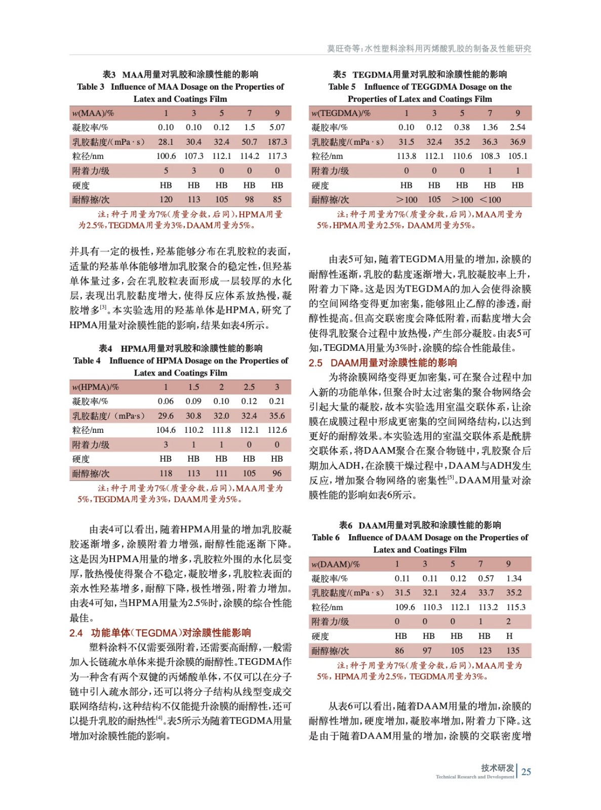 摘要:以苯乙烯、甲基丙烯酸甲酯為主單體,甲基丙烯酸羥乙酯、甲基丙烯酸、三縮四乙二醇二甲基丙烯酸酯、雙丙酮丙烯酰胺和己二酸二酰肼為功能單體,合成了性能優(yōu)異的塑料涂料用水性樹脂。實驗結(jié)果得出:MAA用量為5%(質(zhì)量分數(shù),后同)時,HPMA用量為2.5%時,TEGDMA用量為3%時,DAAM用量為5%時制備的乳膠配置的鋁粉漆,具有附著力好、強耐醇等綜合性能。