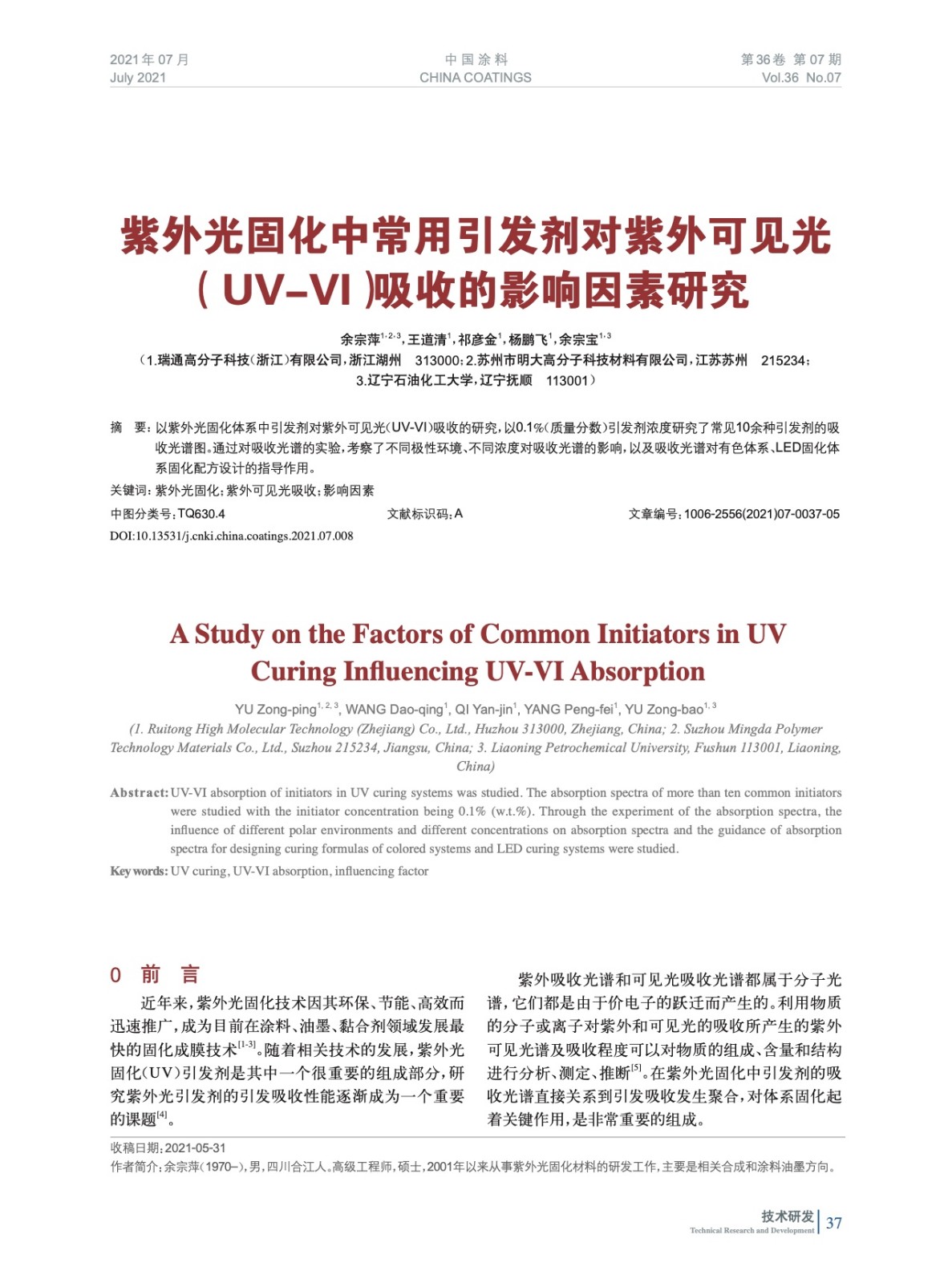 紫外光固化中常用引發劑對紫外可見光(UV-VI)吸收的影響因素研究