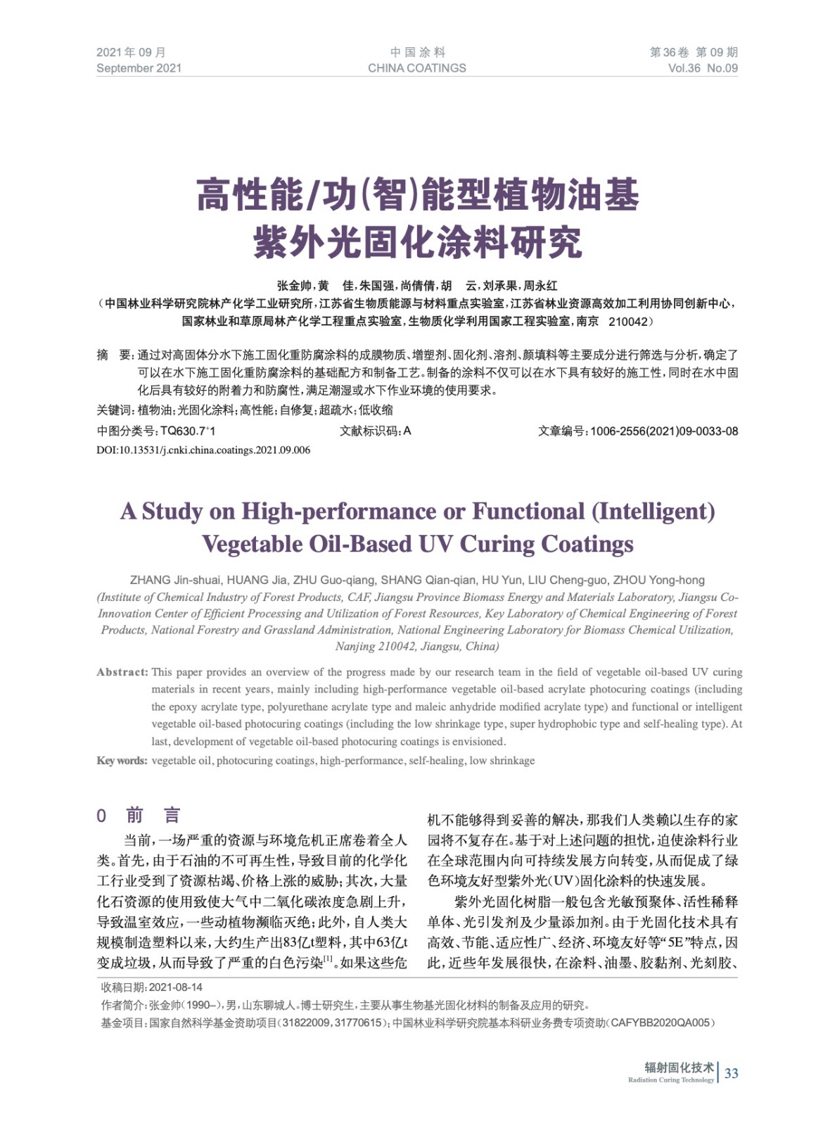 高性能/功(智)能型植物油基紫外光固化涂料研究