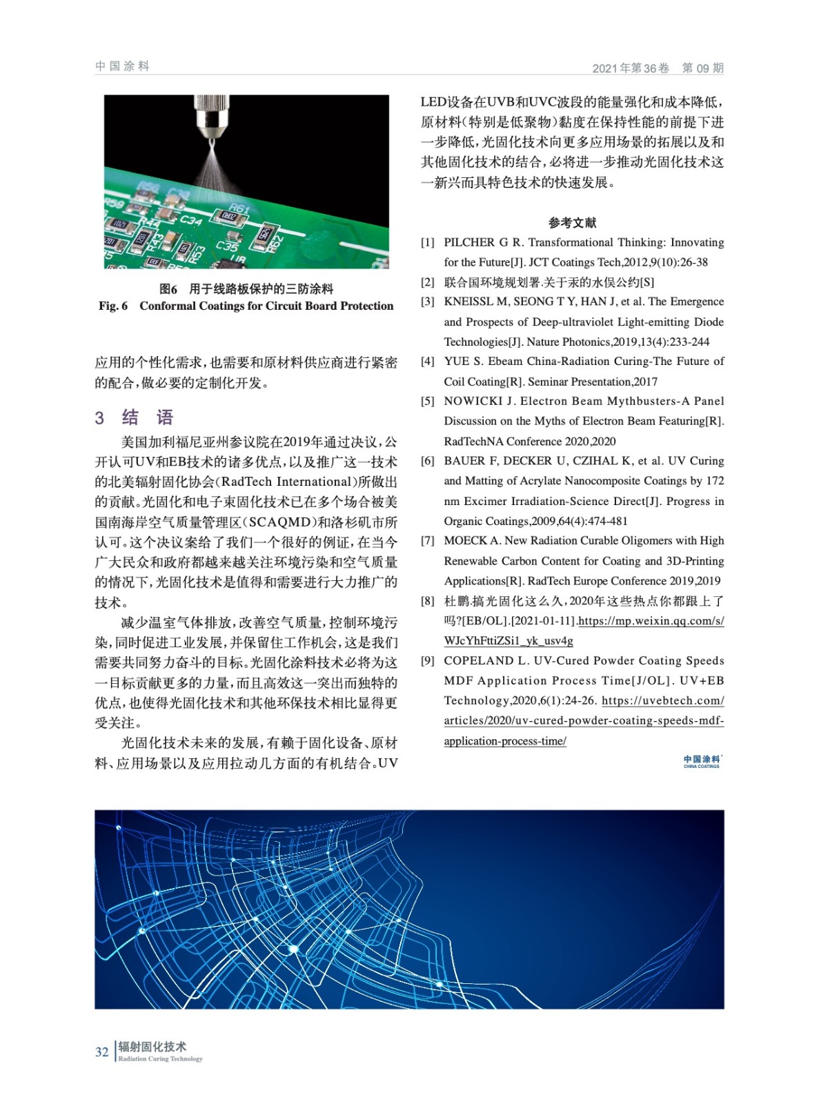 摘要:簡單回顧了光固化技術作為一種綠色環保、高效技術,其在過去的幾十年中的發展歷程。并介紹了固化設備,指出固化設備方面的UV LED、電子束固化、準分子固化拓寬了應用場景,高固低黏、亞光,以及在膜方面的應用等為光固化帶來了新的發展機會,和水性、粉末以及濕氣固化相結合的配合使用,可以對不同的固化技術揚長避短。分析和展望了光固化技術向更多應用場景的拓展以及和其他固化技術的結合,進一步推動光固化技術快速發展。
