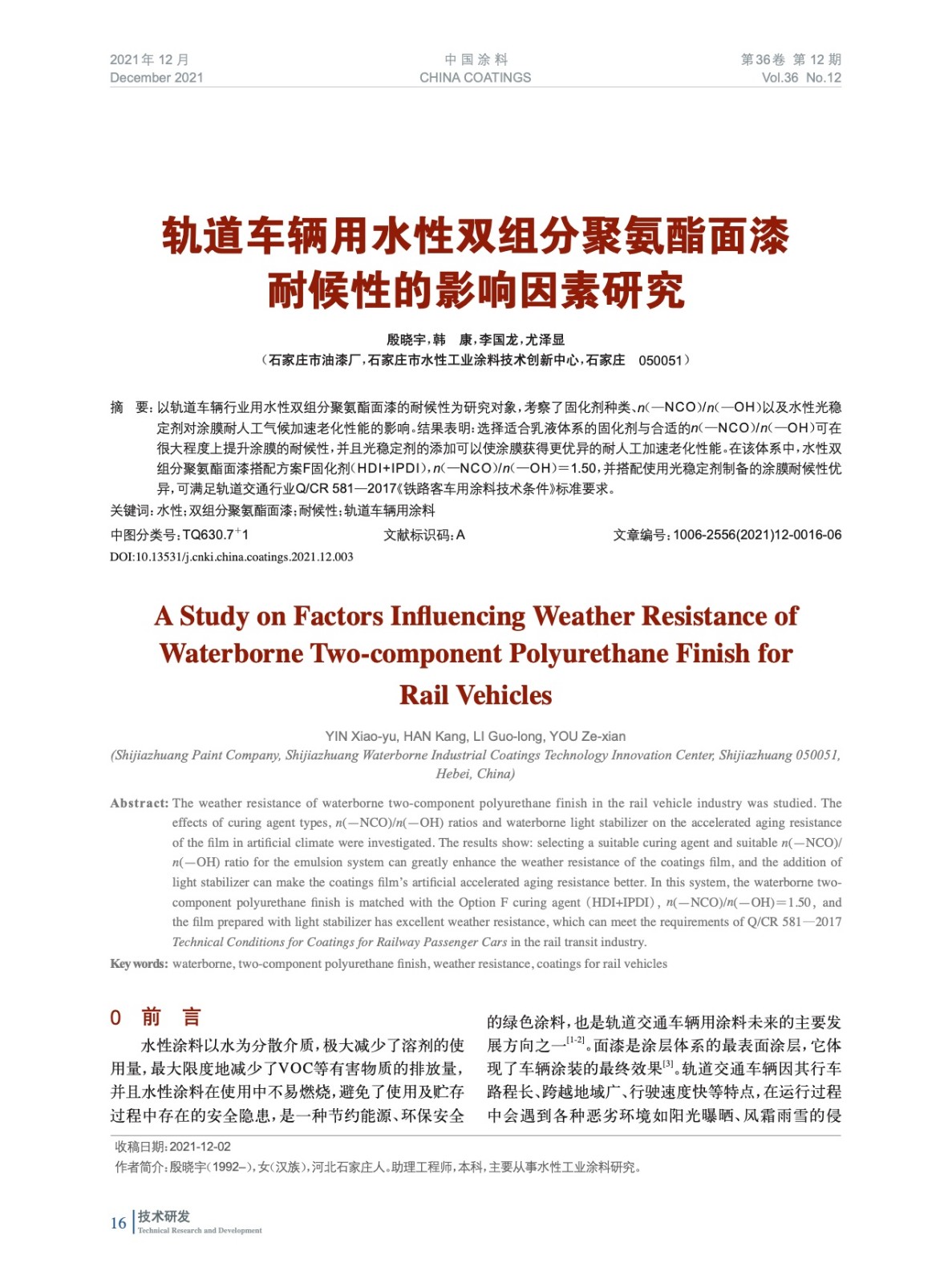軌道車輛用水性雙組分聚氨酯面漆耐候性的影響因素研究