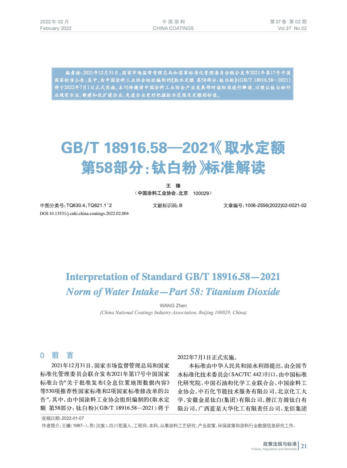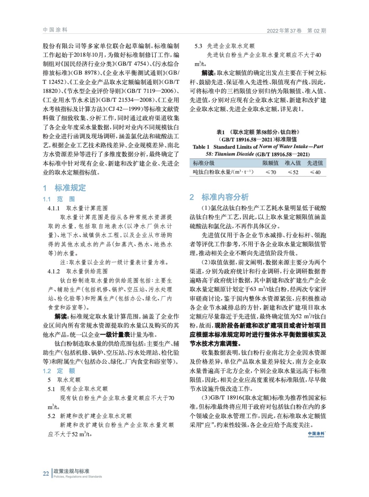 摘要:編者按:2021年12月31日,國家市場監督管理總局和國家標準化管理委員會聯合發布2021年第17號中國國家標準公告,其中,由中國涂料工業協會組織編制的《取水定額 第58部分:鈦白粉》(GB/T 18916.58—2021)將于2022年7月1日正式實施。本刊特邀請中國涂料工業協會產業發展部對該標準進行解讀,以便讓鈦白粉行業現有企業、新建和改擴建企業、先進企業更好把握取水范圍及定額指標值。