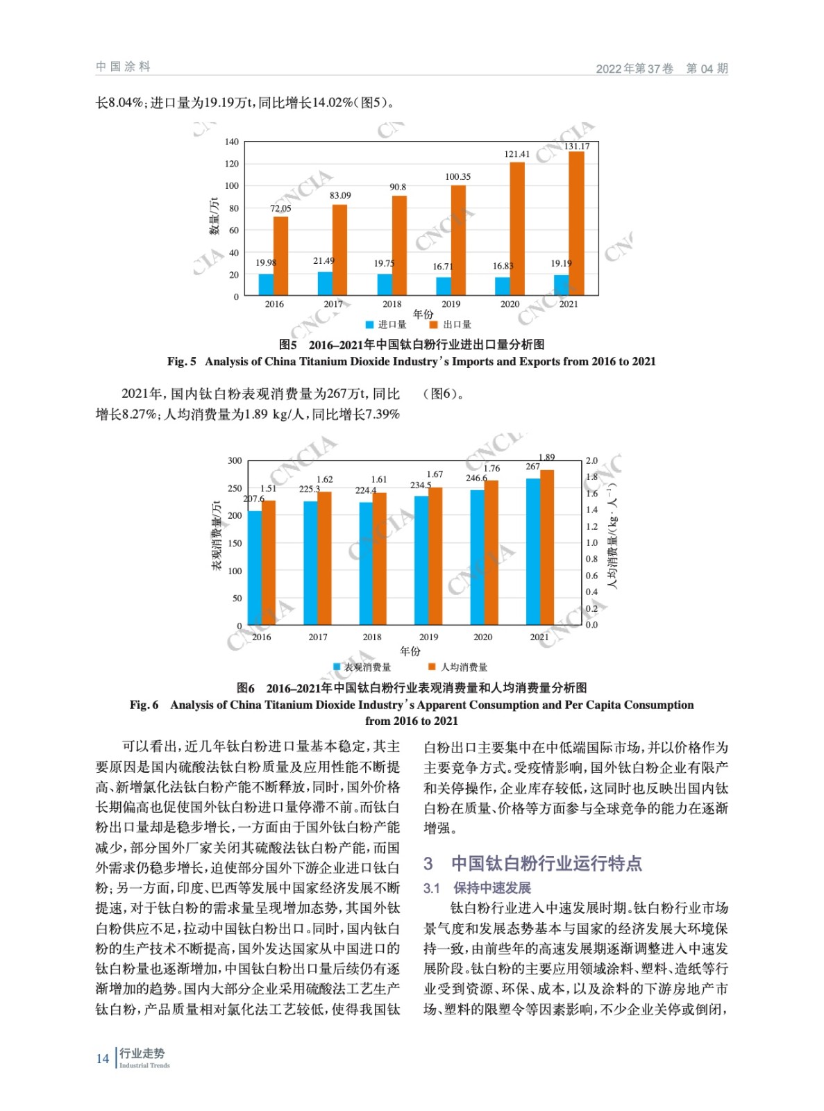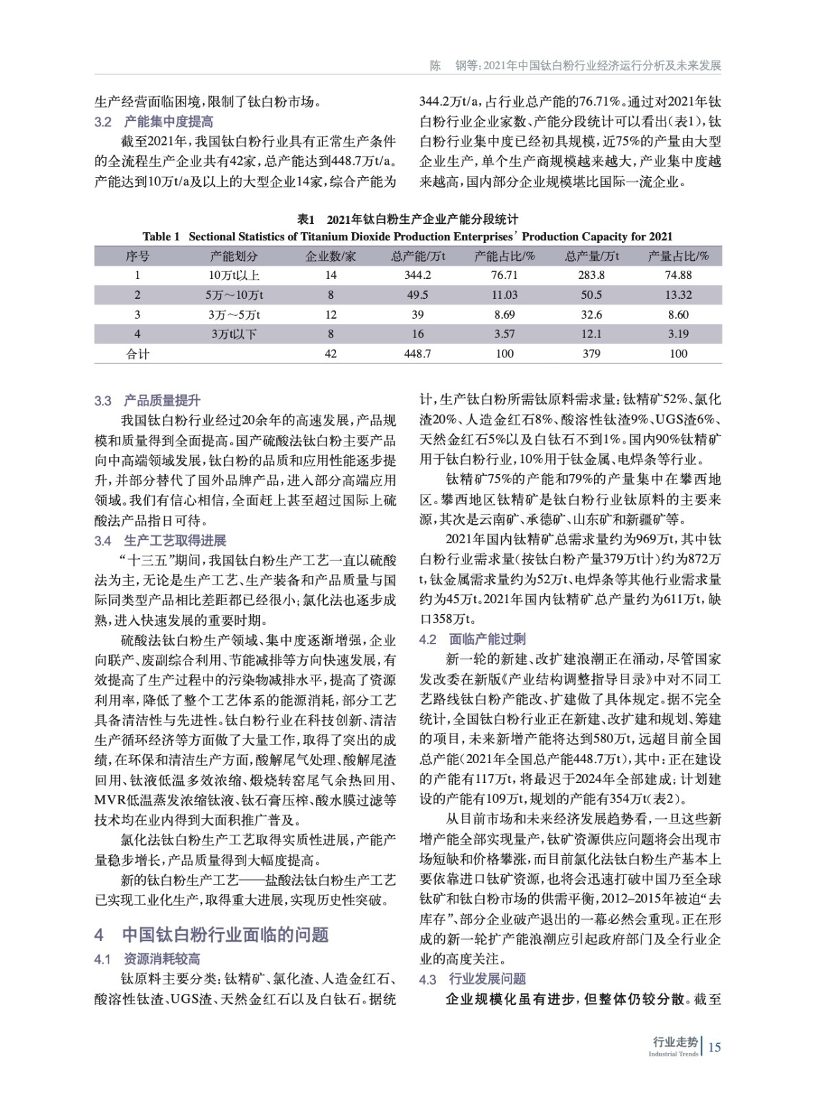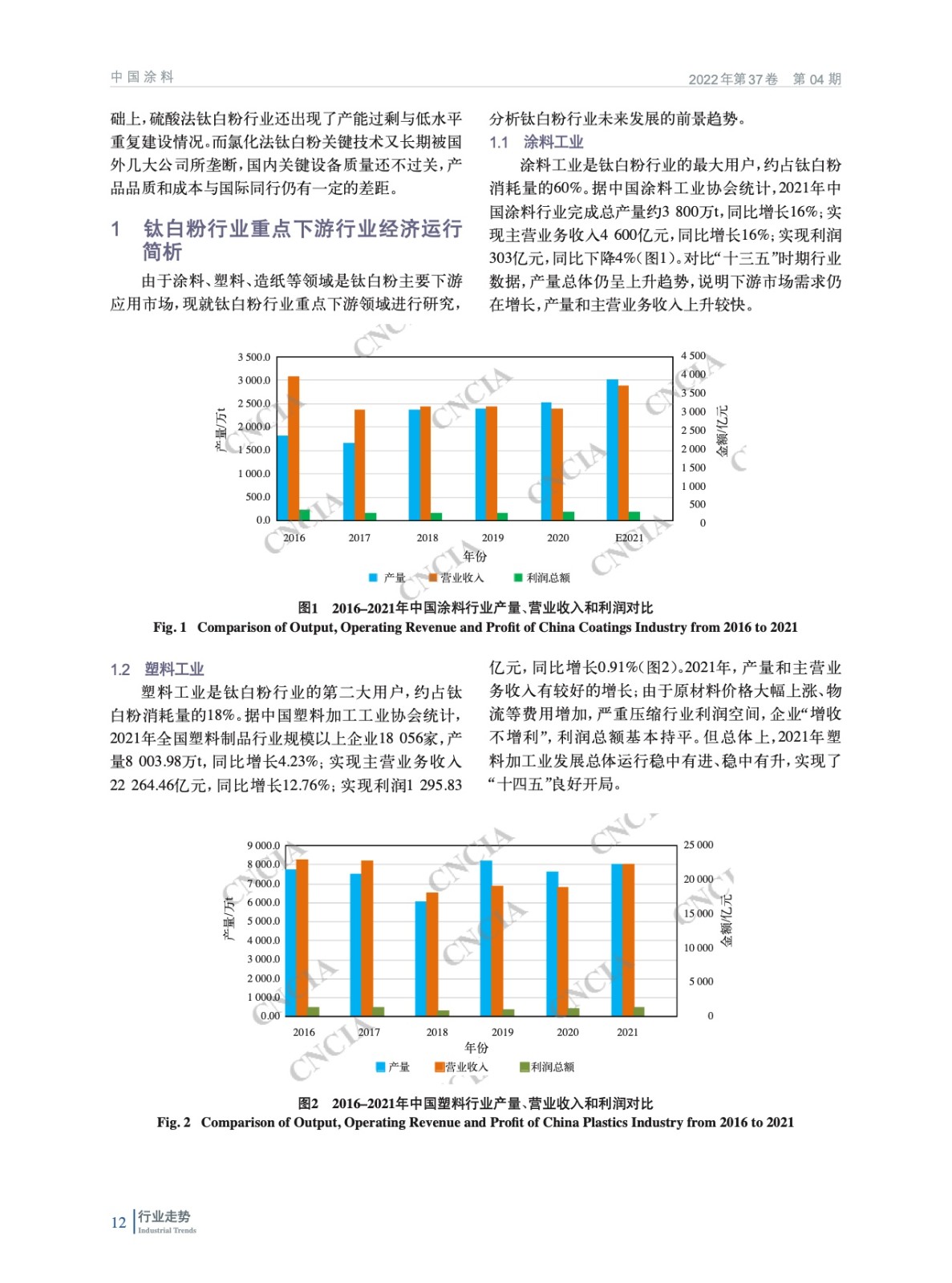 摘要:簡析了鈦白粉行業重點下游行業——涂料、塑料、造紙行業運行情況,分析了2021年中國鈦白粉行業生產、進出口數據,總結了行業運行特點,指出了目前中國鈦白粉行業面臨的問題,指明了行業發展趨勢,并提出有利于我國鈦白粉行業健康發展的相關政策建議。