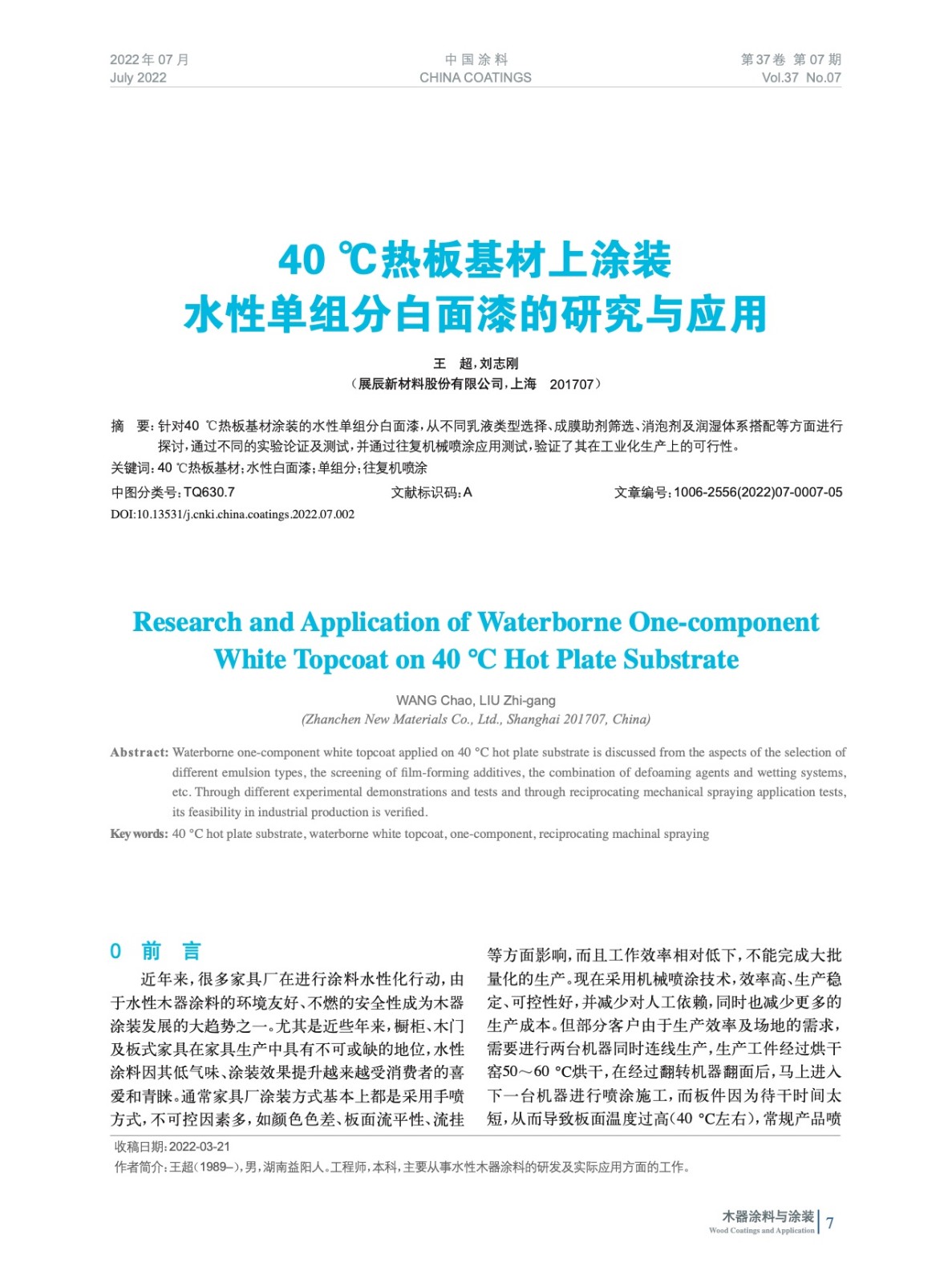 針對40 ℃熱板基材涂裝的水性單組分白面漆,從不同乳液類型選擇、成膜助劑篩選、消泡劑及潤濕體系搭配等方面進行探討,通過不同的實驗論證及測試,并通過往復機械噴涂應用測試,驗證了其在工業化生產上的可行性。