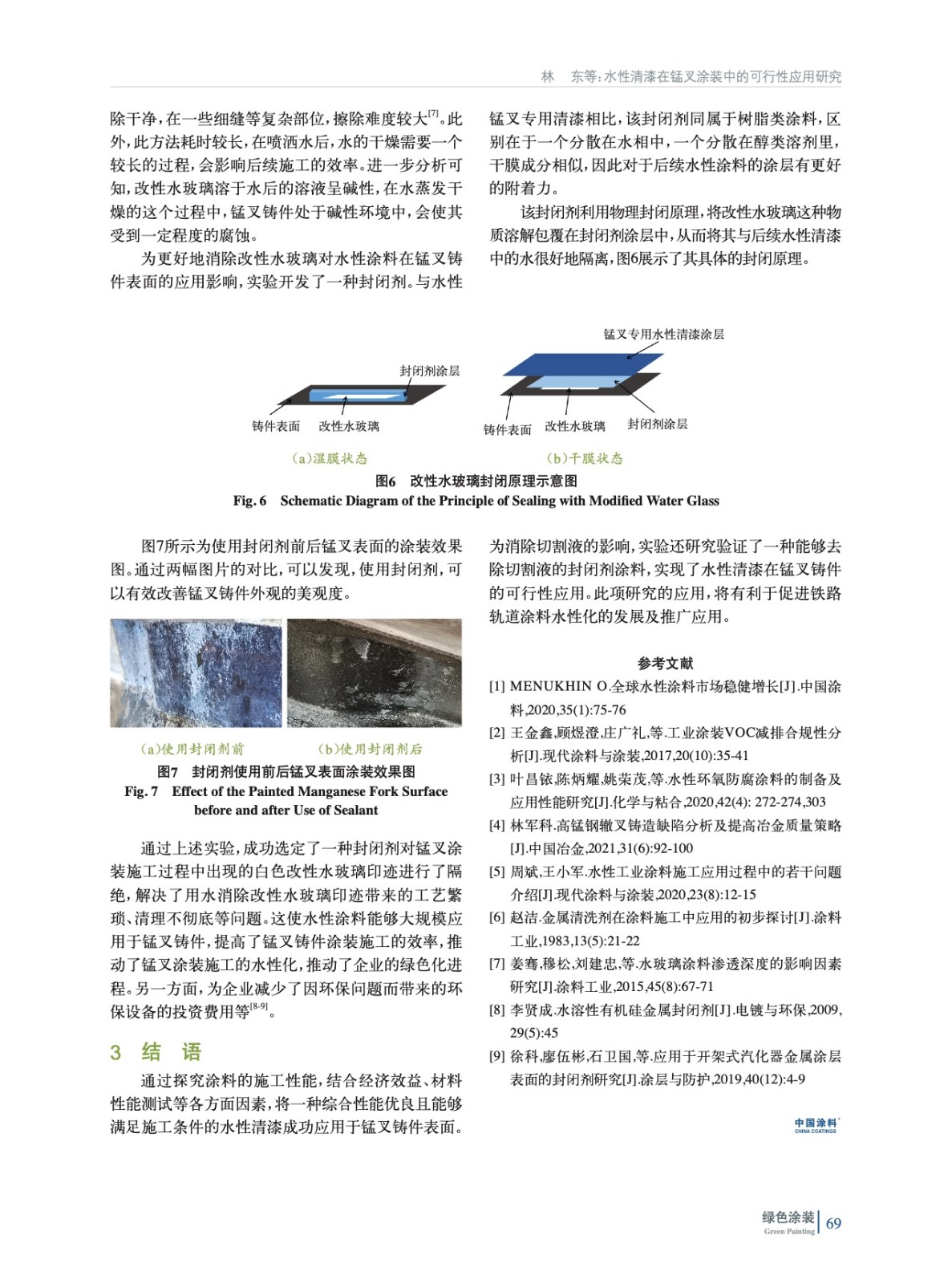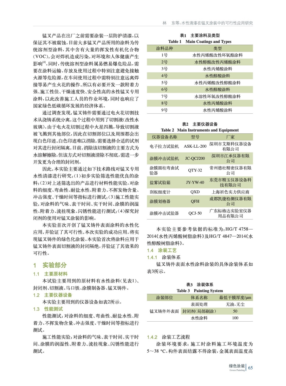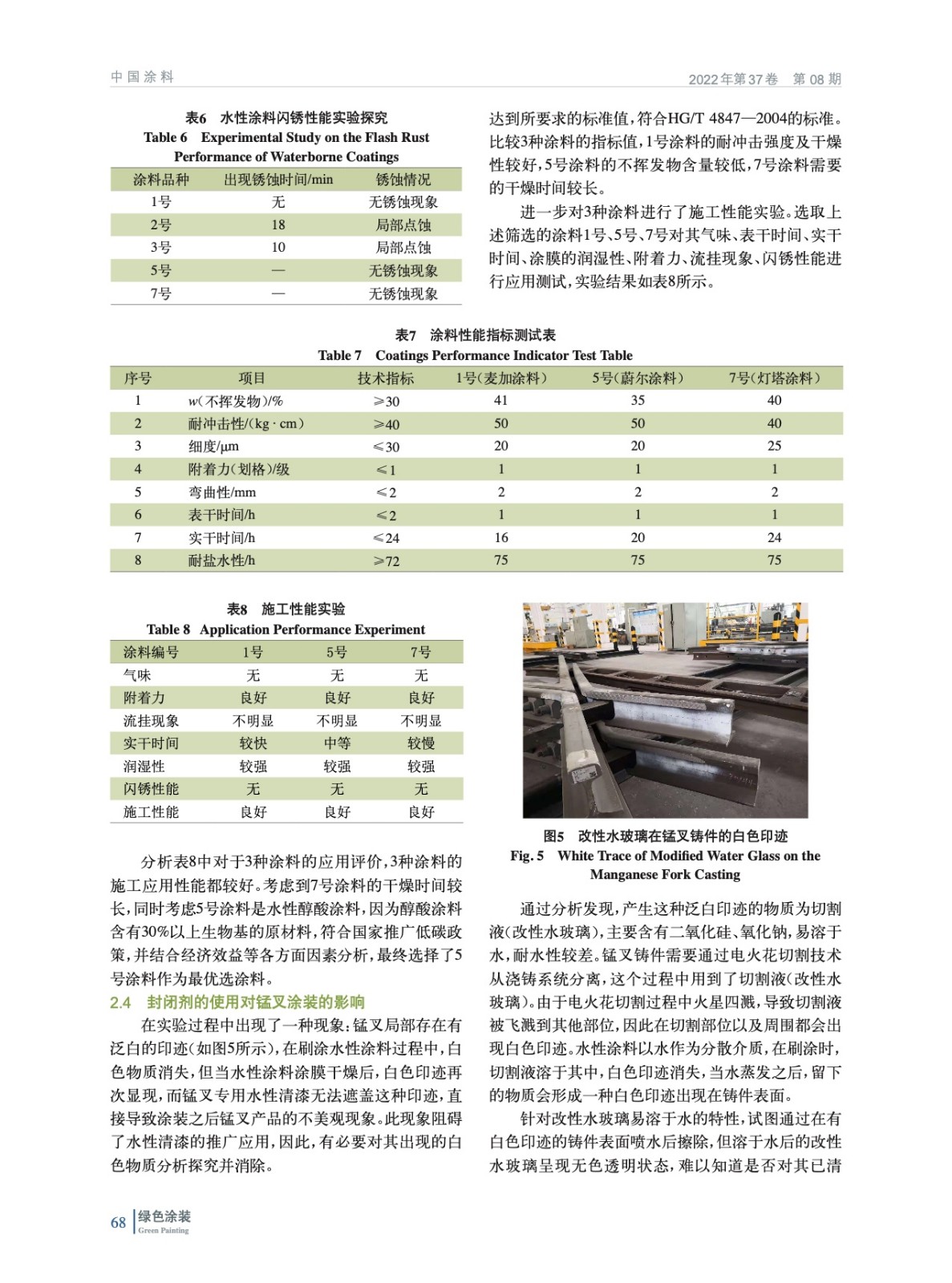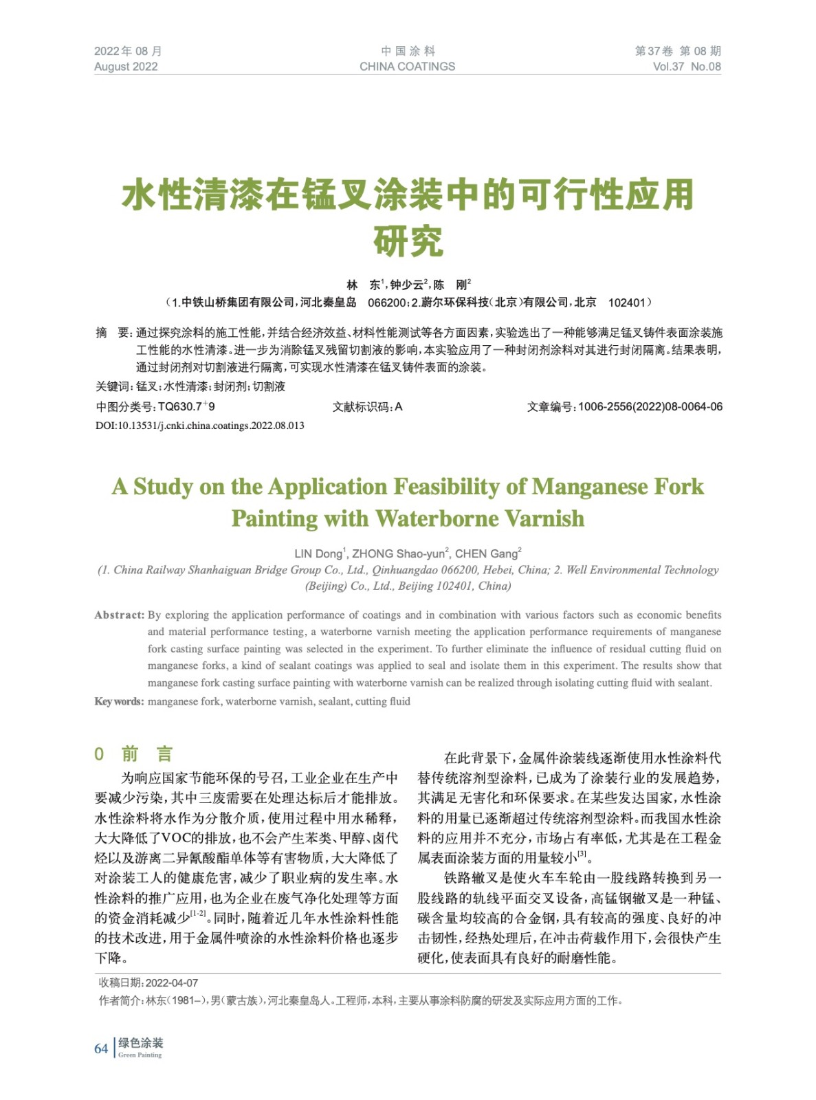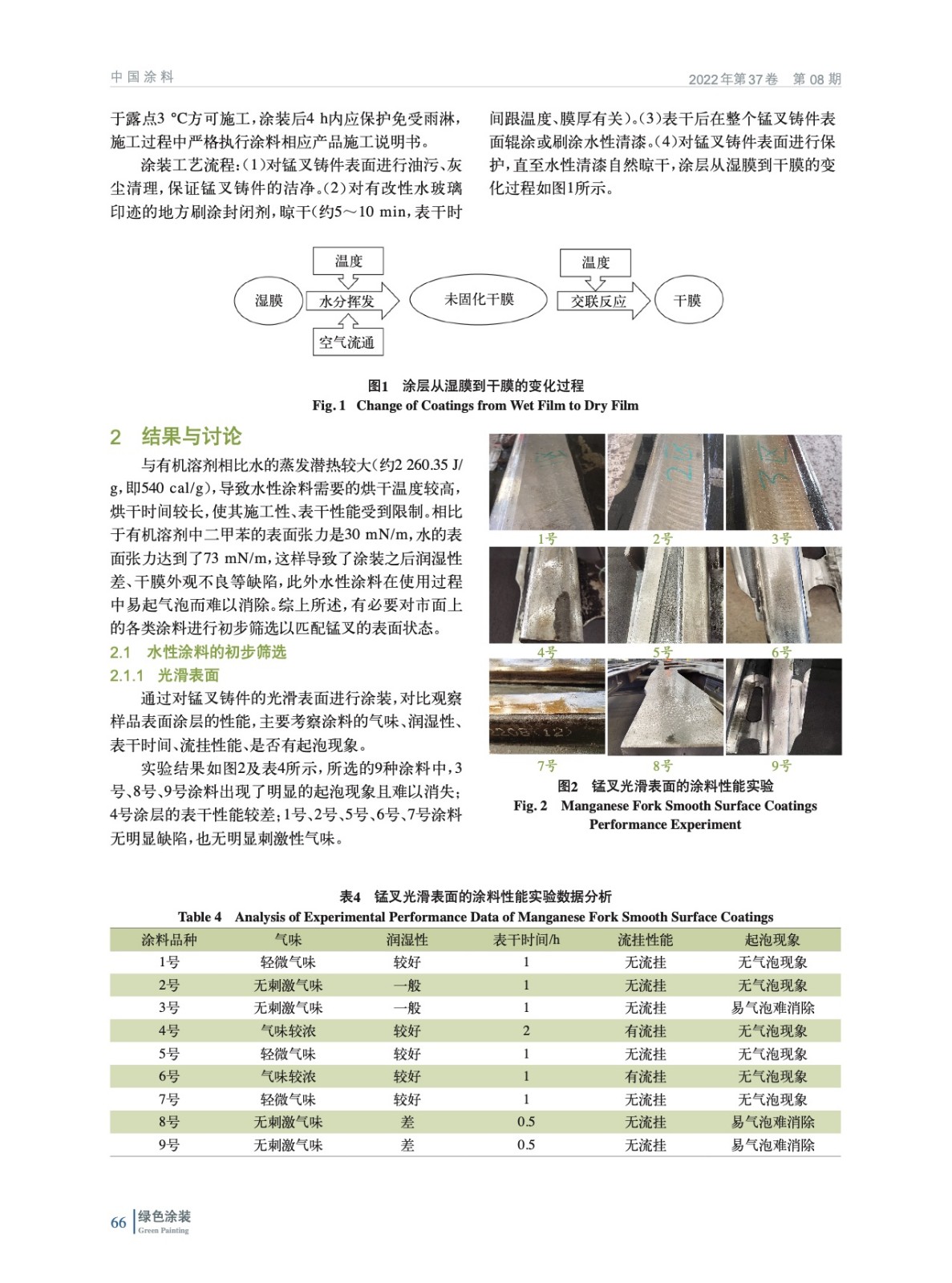 摘要:通過探究涂料的施工性能,并結合經濟效益、材料性能測試等各方面因素,實驗選出了一種能夠滿足錳叉鑄件表面涂裝施工性能的水性清漆。進一步為消除錳叉殘留切割液的影響,本實驗應用了一種封閉劑涂料對其進行封閉隔離。結果表明,通過封閉劑對切割液進行隔離,可實現水性清漆在錳叉鑄件表面的涂裝。