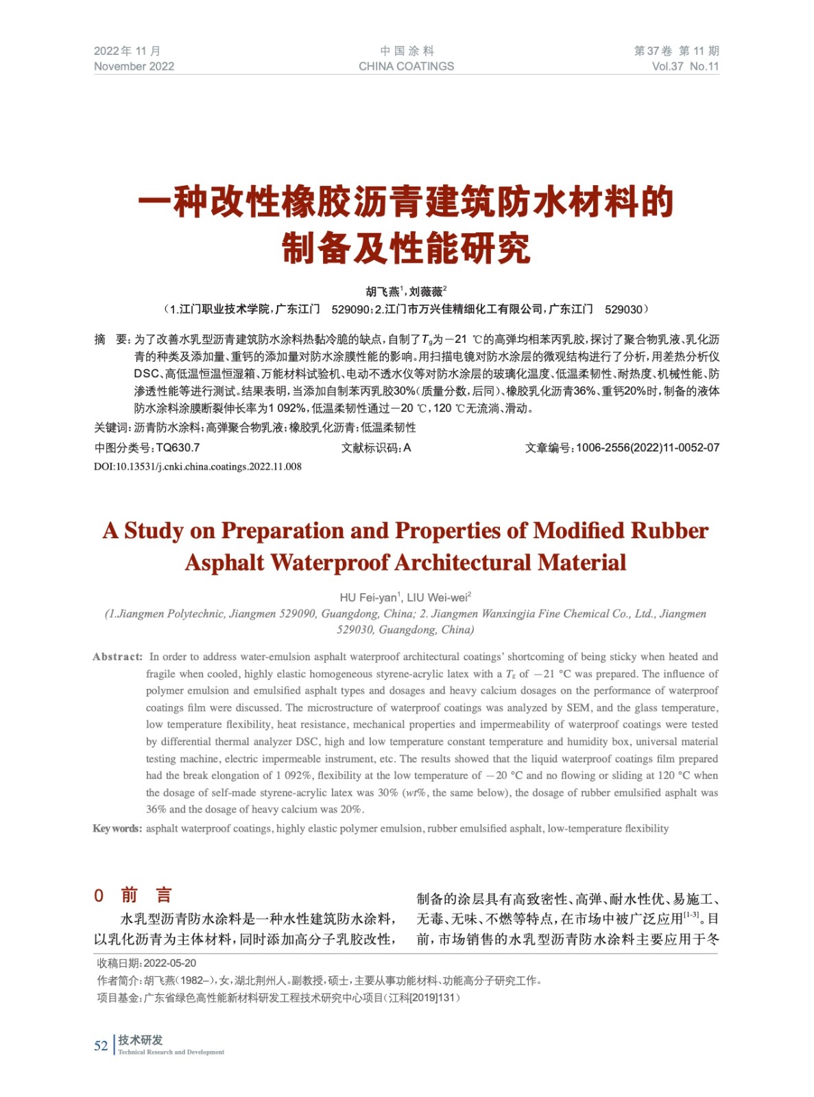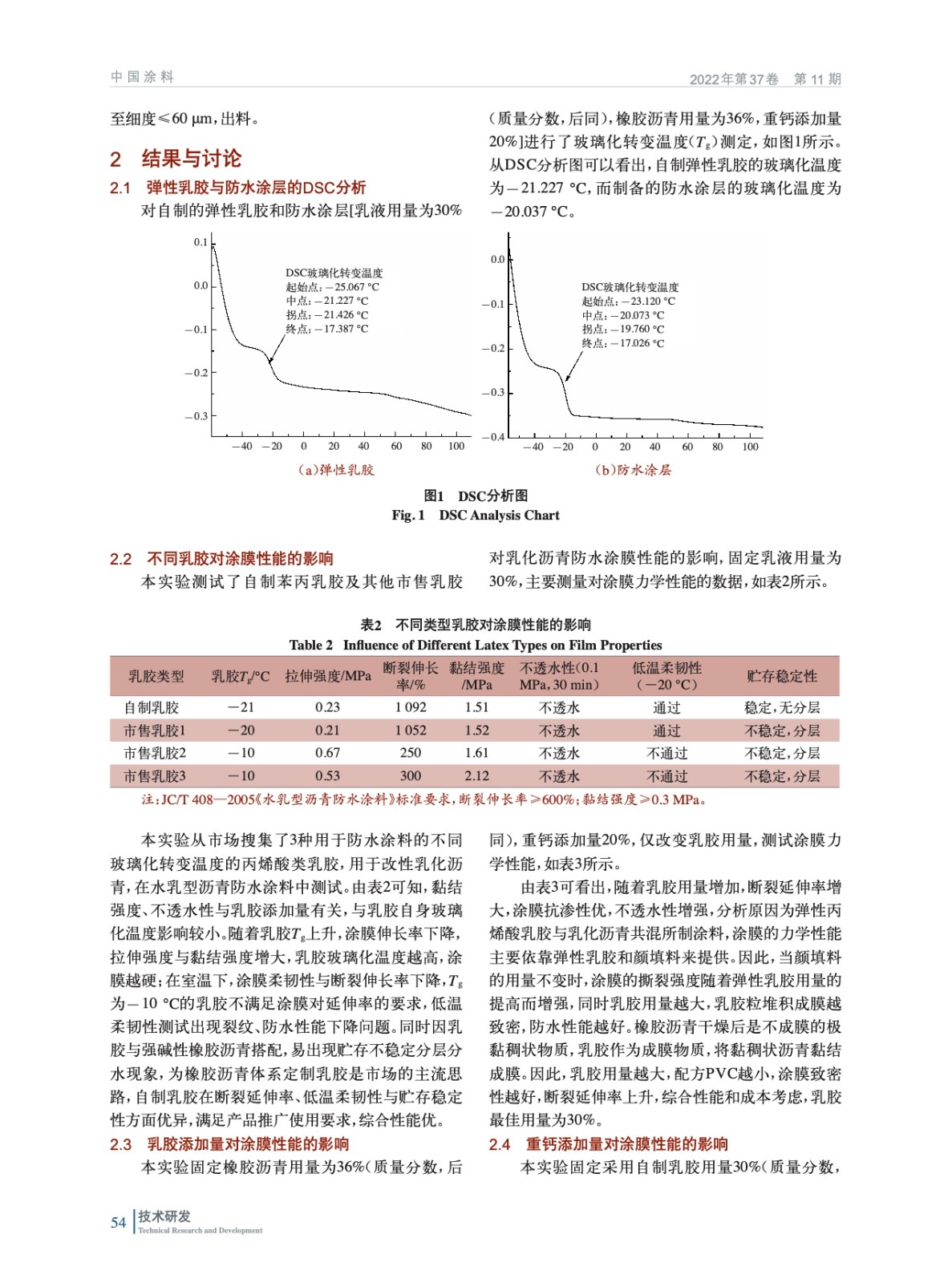 摘要:為了改善水乳型瀝青建筑防水涂料熱黏冷脆的缺點,自制了Tg為-21 ℃的高彈均相苯丙乳膠,探討了聚合物乳液、乳化瀝青的種類及添加量、重鈣的添加量對防水涂膜性能的影響。用掃描電鏡對防水涂層的微觀結(jié)構(gòu)進行了分析,用差熱分析儀DSC、高低溫恒溫恒濕箱、萬能材料試驗機、電動不透水儀等對防水涂層的玻璃化溫度、低溫柔韌性、耐熱度、機械性能、防滲透性能等進行測試。結(jié)果表明,當添加自制苯丙乳膠30%(質(zhì)量分數(shù),后同)、橡膠乳化瀝青36%、重鈣20%時,制備的液體防水涂料涂膜斷裂伸長率為1 092%,低溫柔韌性通過-20 ℃,120 ℃無流淌、滑動。