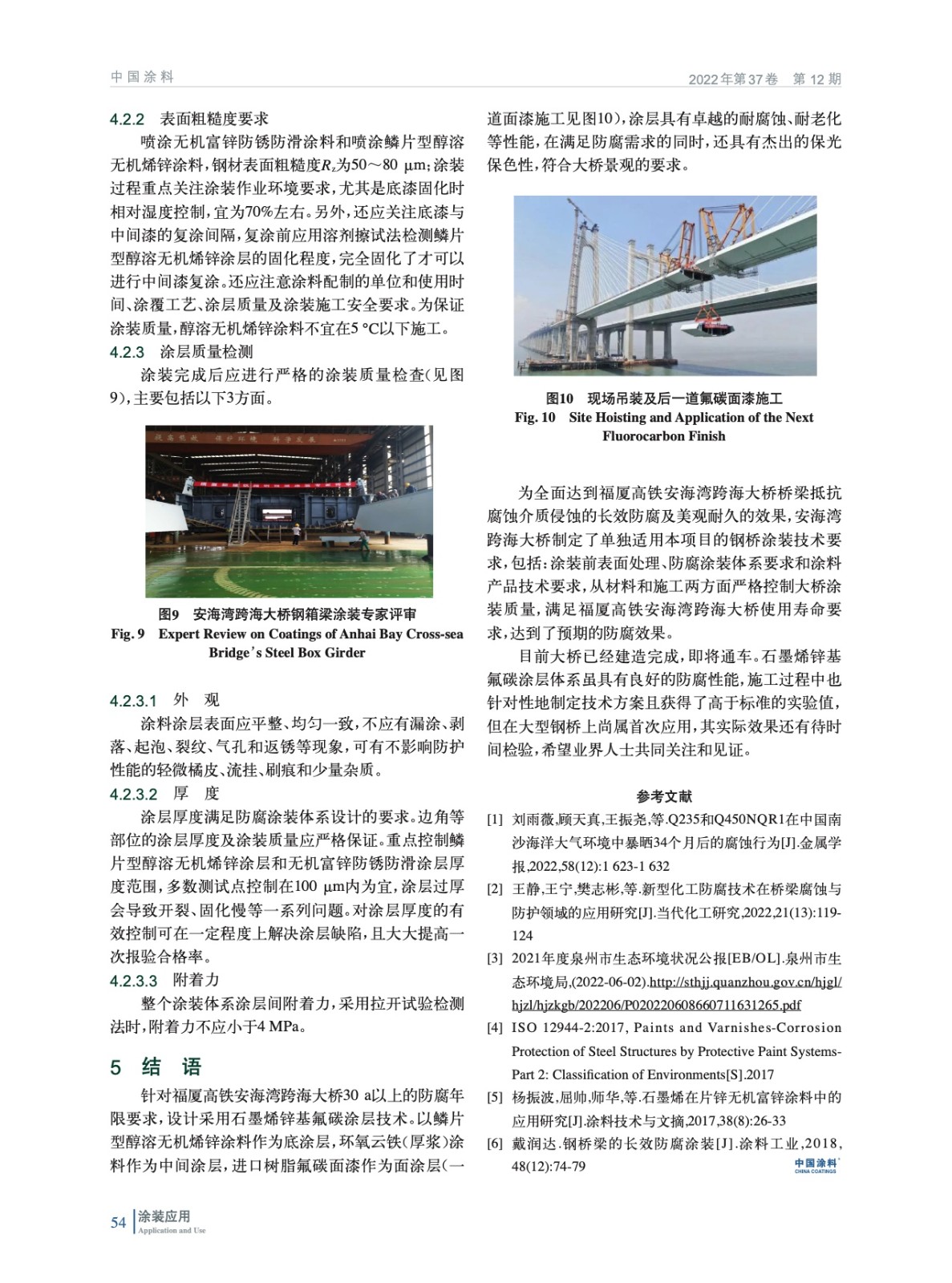 摘要:通過對(duì)福廈高鐵安海灣跨海大橋的腐蝕環(huán)境和腐蝕因素分析,結(jié)合大橋涂裝防腐壽命要求,設(shè)計(jì)了高性能石墨烯鋅基氟碳涂層技術(shù)。采用鱗片型醇溶無機(jī)烯鋅涂料作底涂層,環(huán)氧云鐵(厚漿)涂料作為中間涂層,進(jìn)口樹脂氟碳面漆作為面涂層;通過耐鹽霧、與水接觸角、附著力、人工氣候老化等測(cè)試方法對(duì)涂層性能進(jìn)行了評(píng)價(jià),對(duì)福廈高鐵安海灣跨海大橋表面防腐涂層體系進(jìn)行了研究;通過涂裝前表面處理、防腐涂裝體系要求和涂料產(chǎn)品技術(shù)要求等方面,嚴(yán)格控制大橋涂裝質(zhì)量,使配套體系滿足福廈高鐵安海灣跨海大橋使用壽命要求。