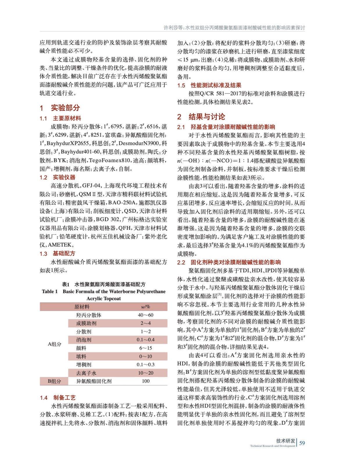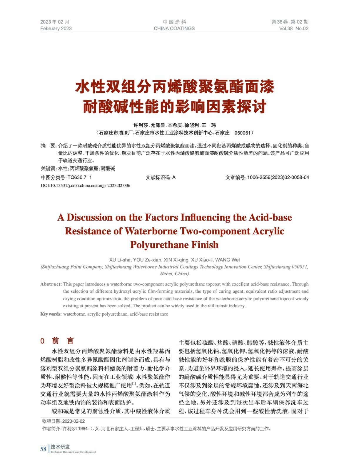 介紹了一款耐酸堿介質性能優異的水性雙組分丙烯酸聚氨酯面漆,通過不同羥基丙烯酸成膜物的選擇、固化劑的種類、當量比的調整、干燥條件的優化,解決目前廣泛存在于水性丙烯酸聚氨酯面漆耐酸堿介質性能差的問題。該產品可廣泛應用于軌道交通行業。