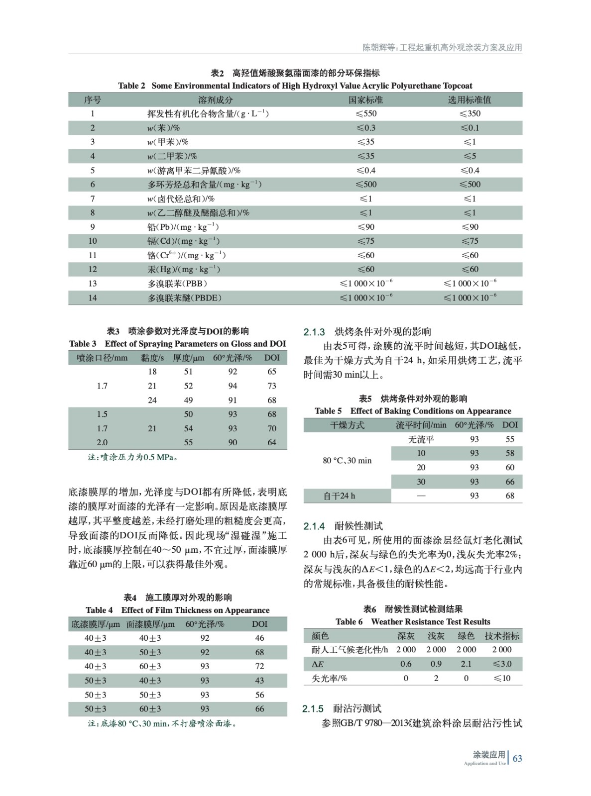 分析了工程起重機涂層的外觀質量要求,并根據工程起重機的通用技術指標和現有的涂裝條件,選取以高羥值丙烯酸涂料為面漆涂層,討論了涂裝工藝中的一些關鍵因素,最終實現了工程起重機的高外觀、高耐候及耐沾污的涂裝。