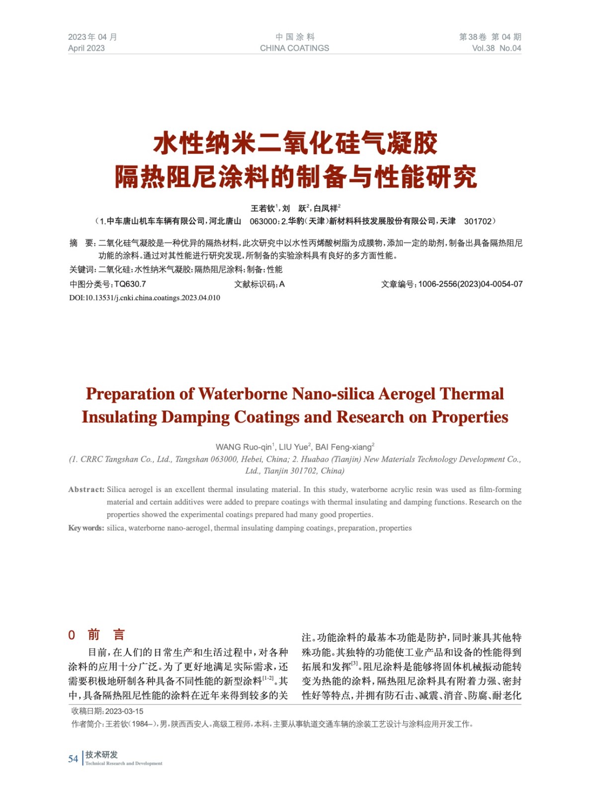摘要:二氧化硅氣凝膠是一種優(yōu)異的隔熱材料,此次研究中以水性丙烯酸樹(shù)脂為成膜物,添加一定的助劑,制備出具備隔熱阻尼功能的涂料。通過(guò)對(duì)其性能進(jìn)行研究發(fā)現(xiàn),所制備的實(shí)驗(yàn)涂料具有良好的多方面性能。