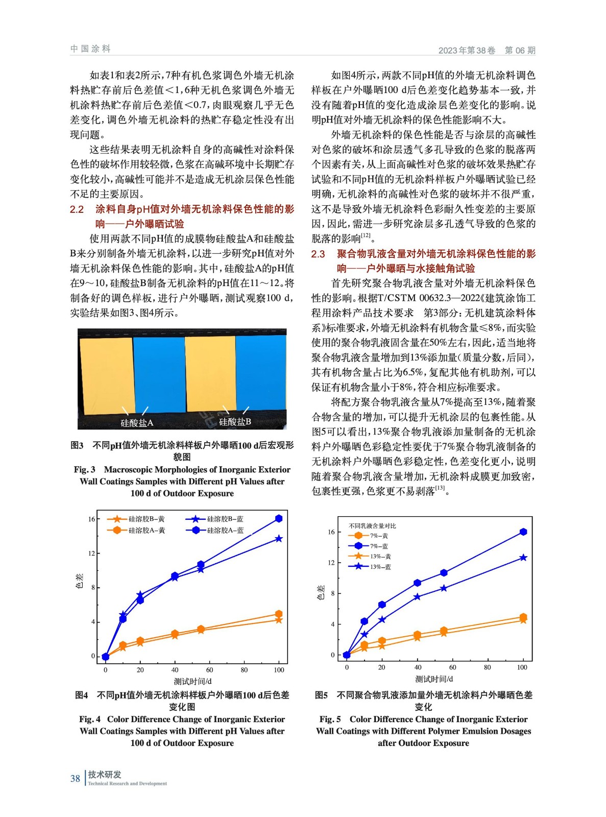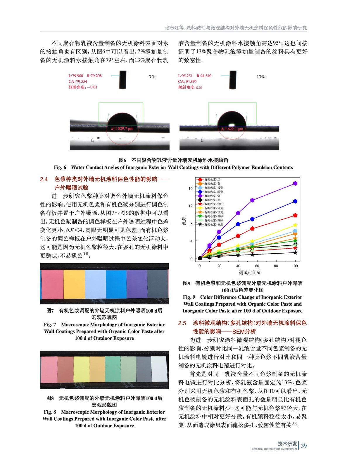 摘要:通過研究涂料堿性與微觀結構對外墻無機涂料保色性能的影響規律作了系統評價。采用SEM、水接觸角和分光色差儀對外墻無機涂料的保色性能進行研究。結果表明:涂料pH值對外墻無機涂料的長期耐候性影響不大,熱貯存30 d,熱貯前后涂料色差變化<1,肉眼幾乎無色差;兩款不同pH值外墻無機涂料調色樣板在戶外曝曬100 d后色差變化趨勢一致,沒有隨著pH值的變化造成色差變化的影響;無機涂料多孔的特點對色差影響最大,乳液含量的增加,可以提升無機涂層對色漿的包裹性能;無機色漿粒徑大,在多孔的無機涂料中更穩定,不易褪色。