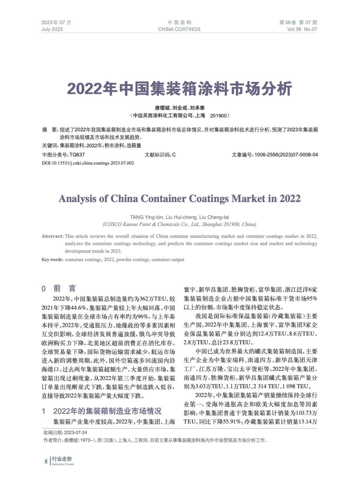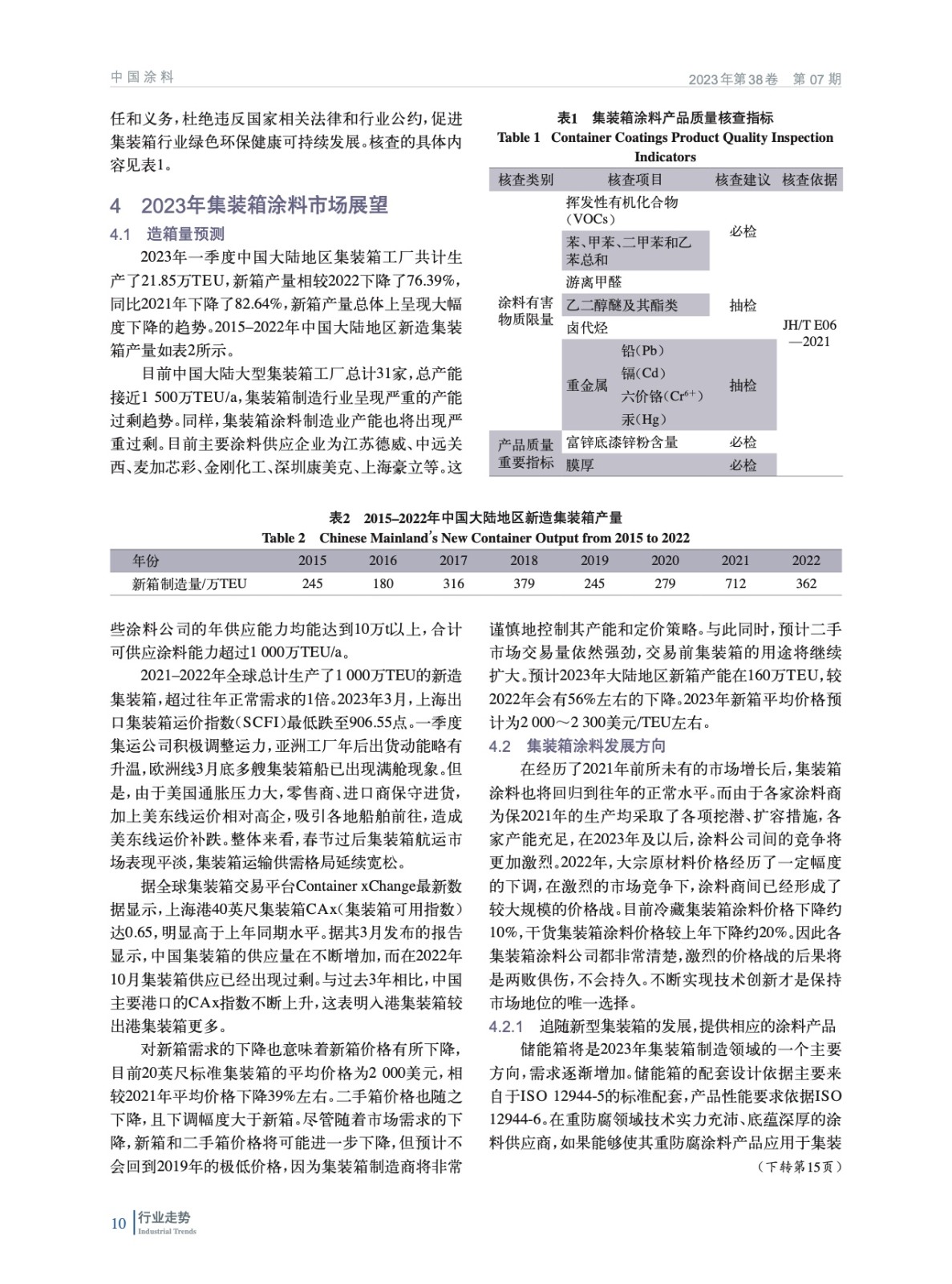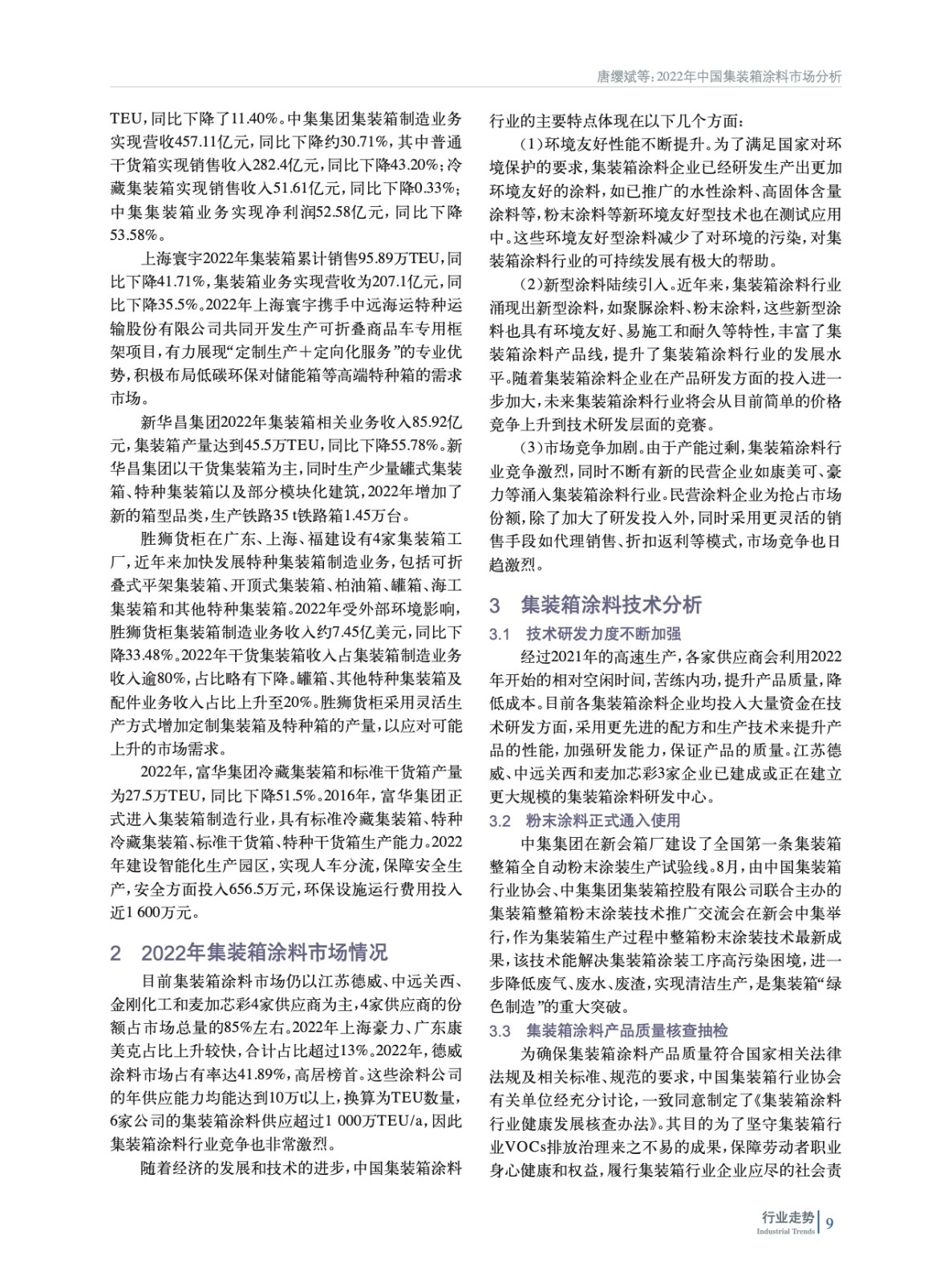 摘要:綜述了2022年我國集裝箱制造業(yè)市場和集裝箱涂料市場總體情況,并對集裝箱涂料技術(shù)進(jìn)行分析,預(yù)測了2023年集裝箱涂料市場規(guī)模及市場和技術(shù)發(fā)展趨勢。