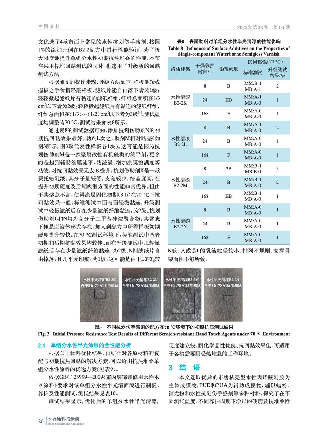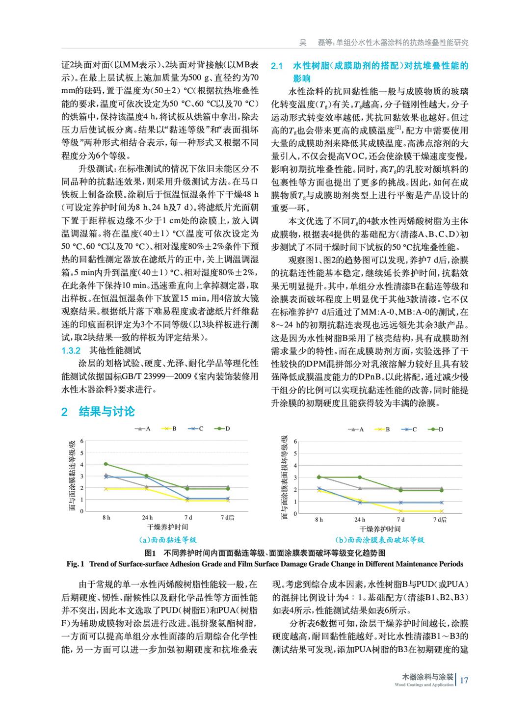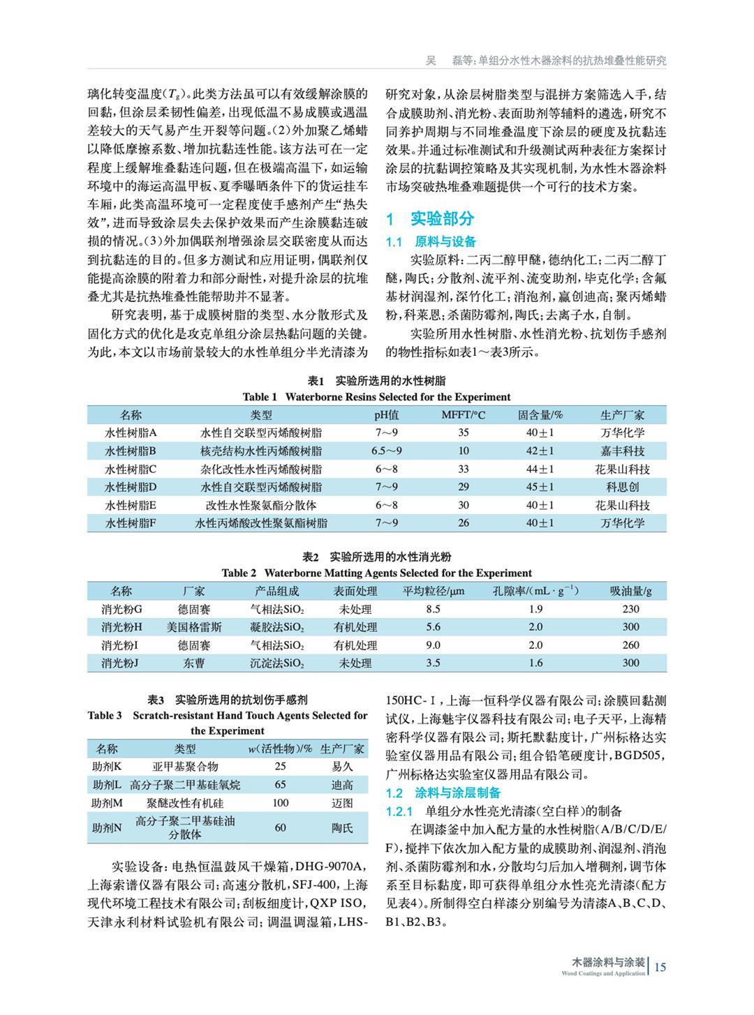 為了開發具備優異初期抗熱堆疊的單組分水性涂料,從成膜物、蠟粉、消光粉和抗劃傷手感劑著手,通過比較不同涂層在不同養護時長下的硬度與抗熱堆疊效果,探討單組分水性涂層的抗黏調控策略及其實現機制,為水性木器市場突破熱堆疊難題提供一個可行的技術方案。