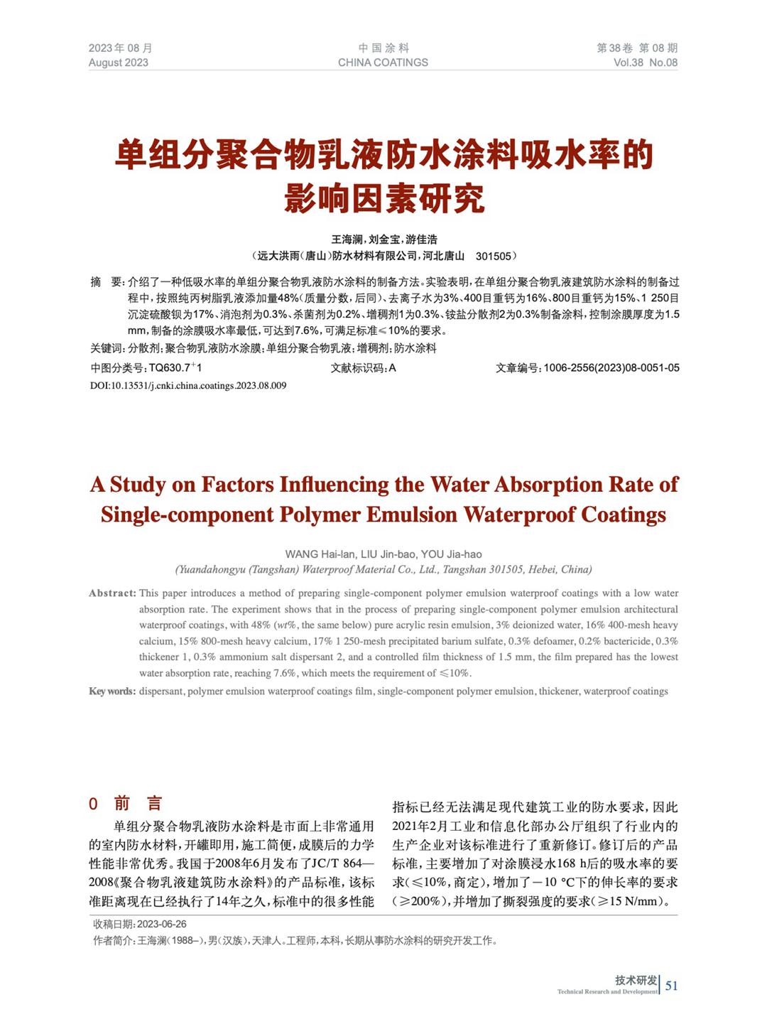 單組分聚合物乳液防水涂料吸水率的影響因素研究