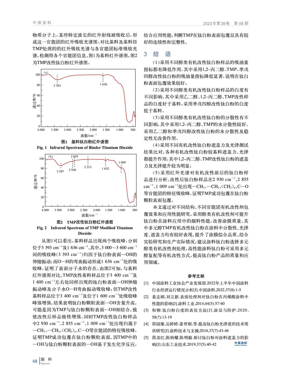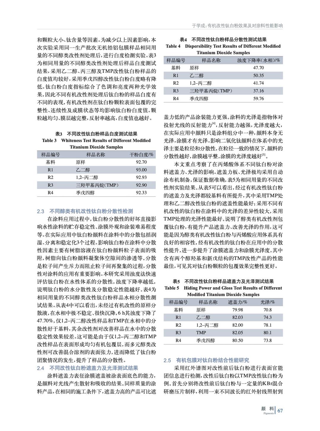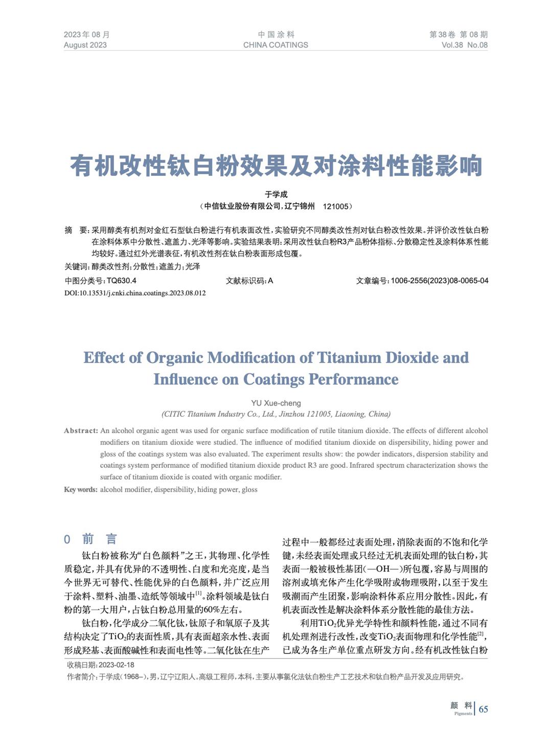 摘要:采用醇類有機劑對金紅石型鈦白粉進行有機表面改性,實驗研究不同醇類改性劑對鈦白粉改性效果。并評價改性鈦白粉在涂料體系中分散性、遮蓋力、光澤等影響。實驗結(jié)果表明:采用改性鈦白粉R3產(chǎn)品粉體指標、分散穩(wěn)定性及涂料體系性能均較好。通過紅外光譜表征,有機改性劑在鈦白粉表面形成包覆。
