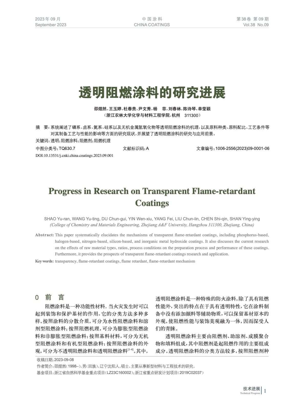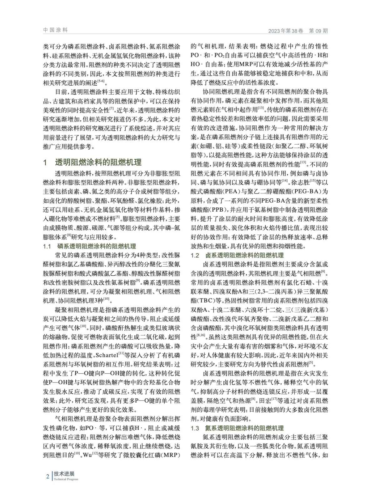 系統闡述了磷系、鹵系、氮系、硅系以及無機金屬氫氧化物等透明阻燃涂料的機理,以及原料種類、原料配比、工藝條件等對其制備工藝與性能的影響等方面的研究現狀,并展望了透明阻燃涂料的研究與應用前景。
