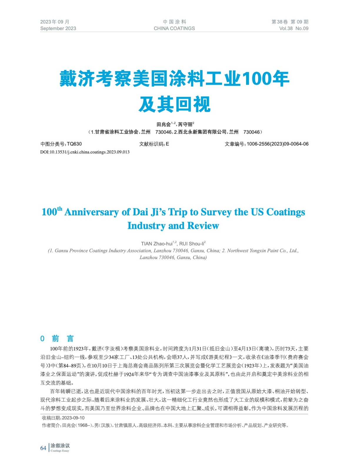 摘要:100年前的1923年,戴濟(字汝楫)考察美國涂料業,時間跨度為1月31日至4月13日,歷時73天,主要沿舊金山–紐約一線,參觀至少34家工廠、13處公共機構,會晤37人,并寫成《游美紀程》一文,收錄在《油漆季刊(費府賽會號)》中,在10月10日于上海總商會商品陳列所第三次展覽會暨化學工藝展覽會(1923年)上,發表題為“美國油漆業之保面運動”的演講,促成杜赫于1924年來華“專為調查中國油漆事業及其原料”,也由此開啟和奠定中美涂料業的相互交流的基礎。當初這第一步走出去之時,正值我國從原始大漆、桐油開始轉型、現代涂料工業起步之際。此行作為中國涂料發展歷程的一個標志性和重大活動,本應是值得紀念的,由此再提和回視百年前的考察,也更應有其價值和意義。