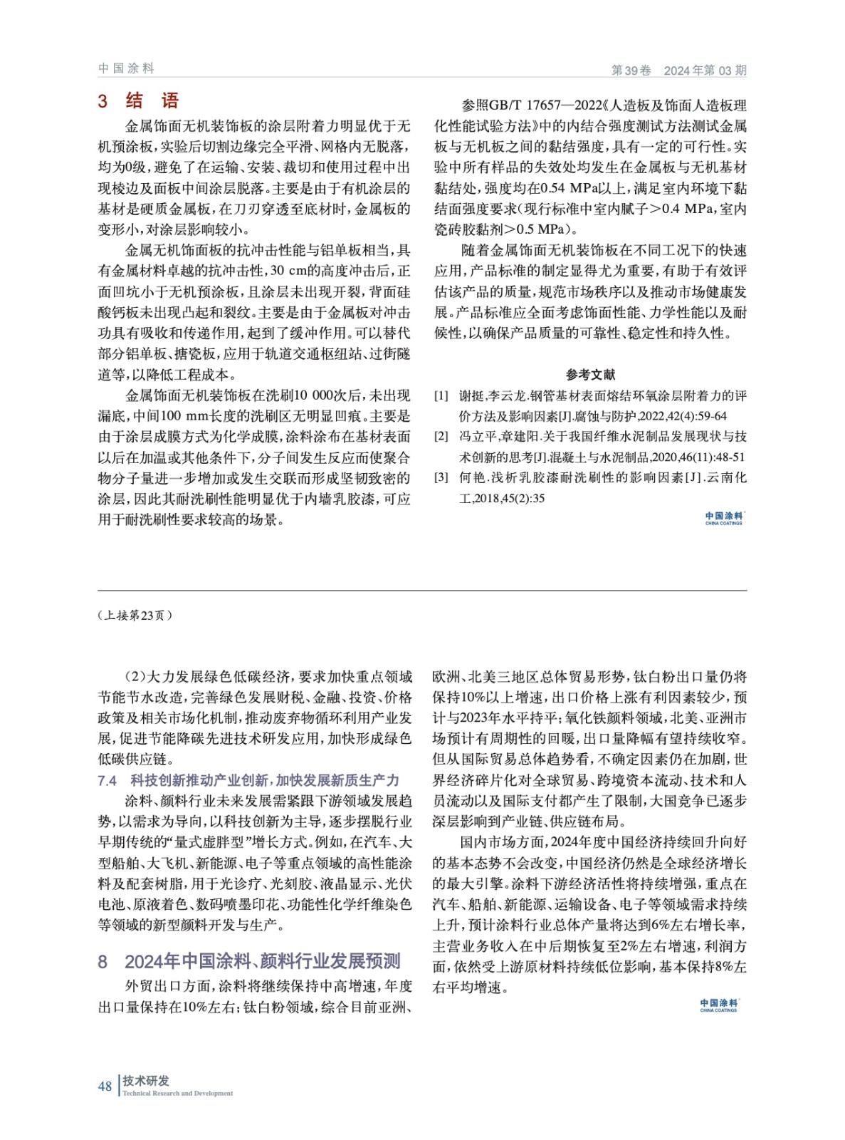 摘要:參照涂料相關的標準研究了金屬飾面無機裝飾板主要飾面性能及金屬板與無機板的黏結強度。結果表明:金屬飾面無機裝飾板具有卓越的涂層附著力、抗沖擊性能,涂層附著力等級為0級,切割邊緣完全平滑、網格內無脫落。30 cm高度的沖擊后,涂層未出現開裂,背面硅酸鈣板未出現凸起和裂紋,與金屬材料鋁單相當,可以替代部分鋁單板、搪瓷板,應用于軌道交通樞紐站、過街隧道等,以降低工程成本。由于成膜方式為化學成膜,洗刷10 000次后,金屬飾面無機裝飾板的飾面層中間100 mm長度的洗刷區無明顯凹痕;參照GB/T 17657—2022中的內結合強度方法測試金屬板與無機板之間的黏結強度,具有一定的可行性,金屬板與無機基材黏結處強度均在0.54 MPa以上,滿足室內環境下黏結面強度要求。