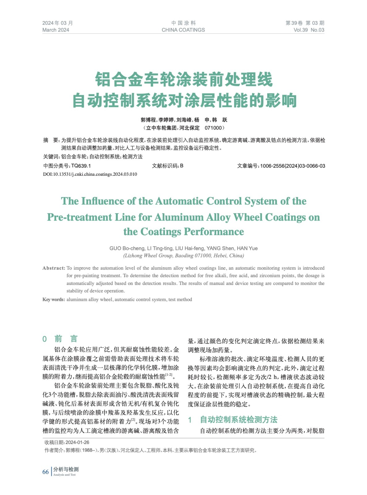 摘要:為提升鋁合金車(chē)輪涂裝線自動(dòng)化程度,在涂裝前處理引入自動(dòng)監(jiān)控系統(tǒng)。確定游離堿、游離酸及鋯點(diǎn)的檢測(cè)方法,依據(jù)檢測(cè)結(jié)果自動(dòng)調(diào)整加藥量。對(duì)比人工與設(shè)備檢測(cè)結(jié)果,監(jiān)控設(shè)備運(yùn)行穩(wěn)定性。