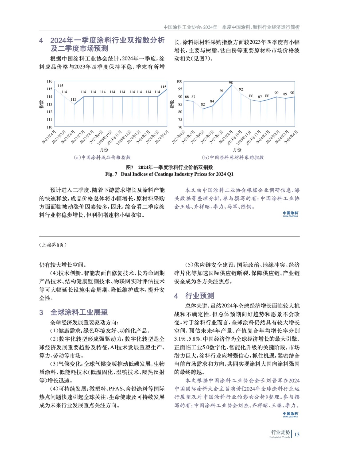 摘要:簡析了2024年第一季度我國涂料行業(yè)生產(chǎn)、經(jīng)營和涂料、無機(jī)顏料行業(yè)進(jìn)出口簡況,并對(duì)丙烯酸乳液、環(huán)氧樹脂等重點(diǎn)成膜物質(zhì)市場進(jìn)行了綜述和預(yù)測(cè)。對(duì)2024年一季度涂料行業(yè)雙指數(shù)進(jìn)行了分析,并對(duì)二季度市場進(jìn)行了預(yù)測(cè)。