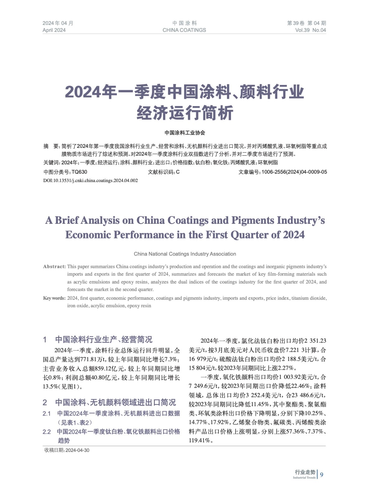 2024年一季度中國涂料、顏料行業(yè)經(jīng)濟(jì)運(yùn)行簡析