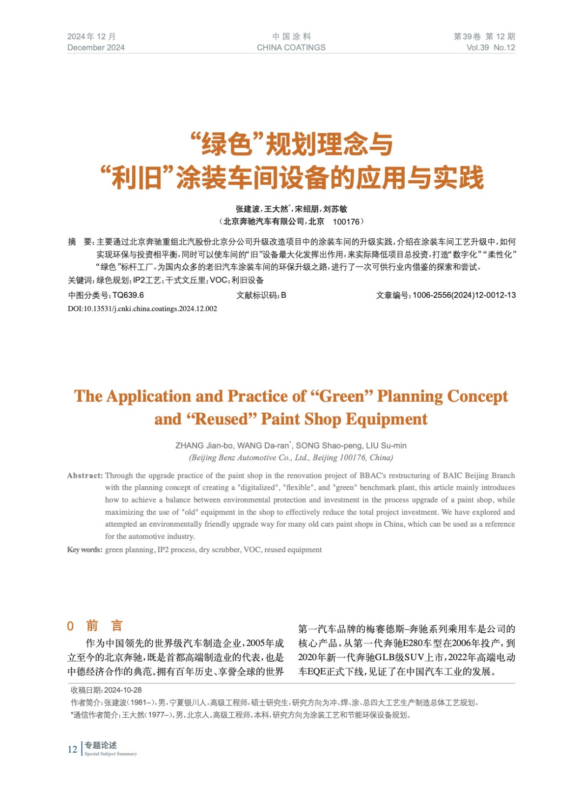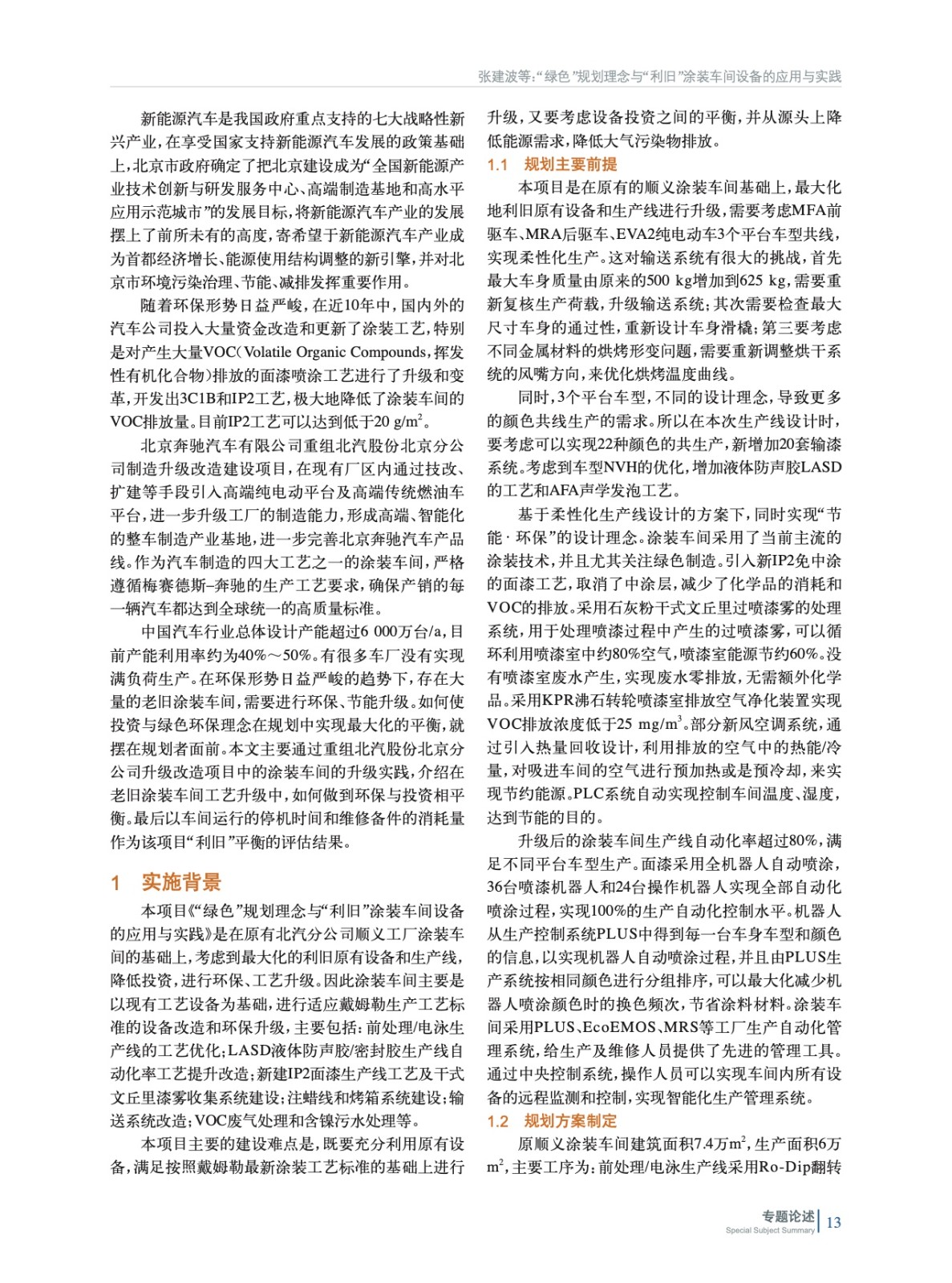 摘要:主要通過北京奔馳重組北汽股份北京分公司升級(jí)改造項(xiàng)目中的涂裝車間的升級(jí)實(shí)踐,介紹在涂裝車間工藝升級(jí)中,如何實(shí)現(xiàn)環(huán)保與投資相平衡,同時(shí)可以使車間的“舊”設(shè)備最大化發(fā)揮出作用,來實(shí)際降低項(xiàng)目總投資,打造“數(shù)字化”“柔性化”“綠色”標(biāo)桿工廠。為國內(nèi)眾多的老舊汽車涂裝車間的環(huán)保升級(jí)之路,進(jìn)行了一次可供行業(yè)內(nèi)借鑒的探索和嘗試。