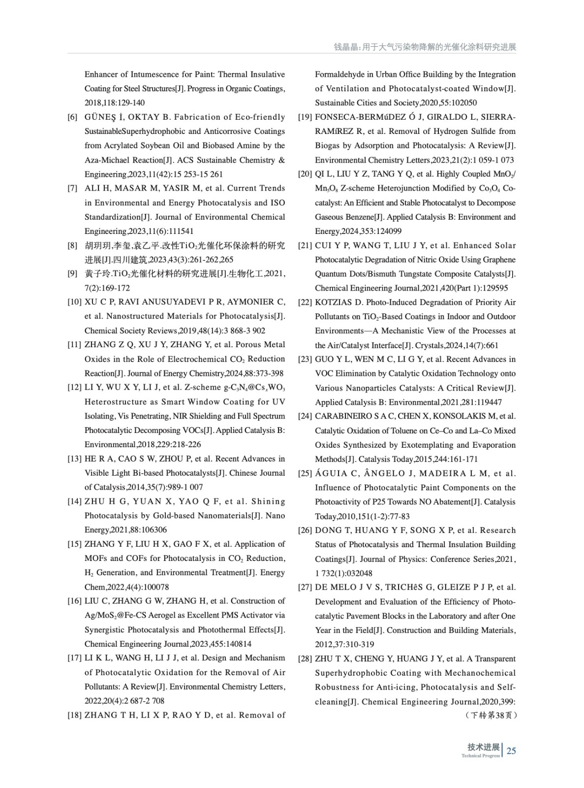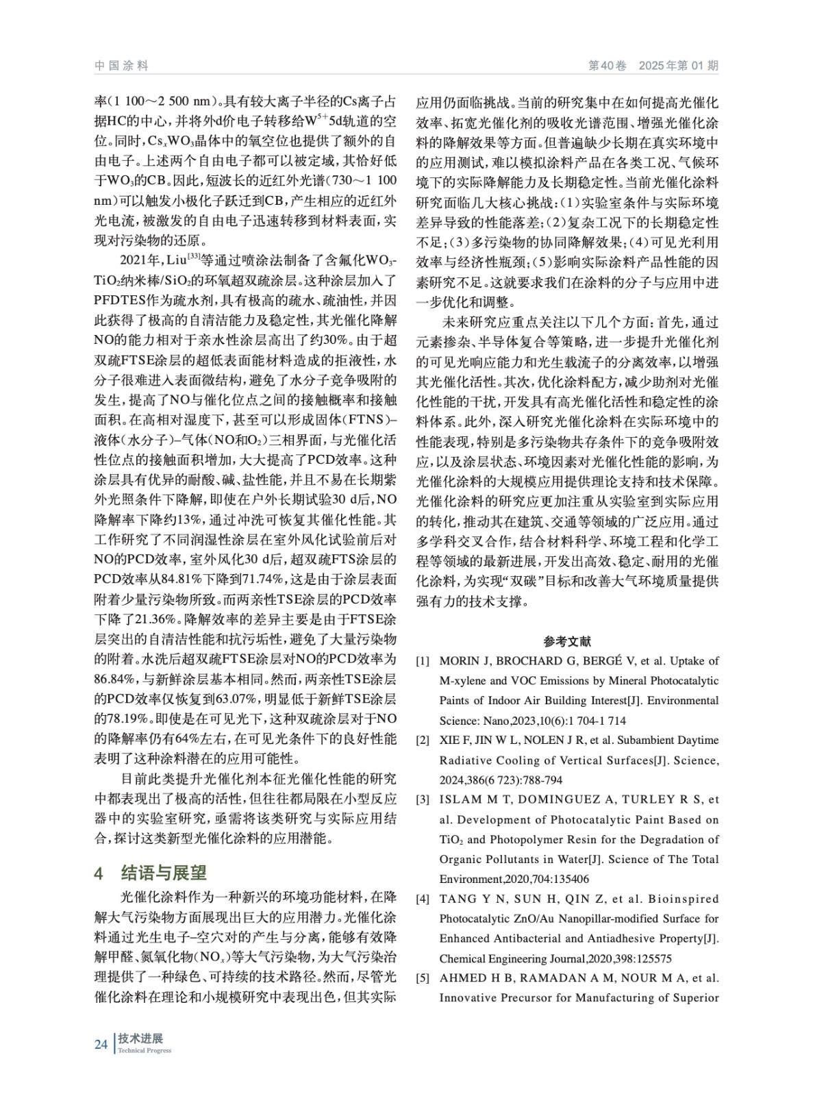 摘要:綜述了光催化涂料的研究進展,探討了涂料的光催化基本原理、關(guān)鍵光催化材料的性能,以及通過元素摻雜和半導(dǎo)體復(fù)合等手段提高光催化效率的策略。探討了光催化涂料中的非本征和本征因素影響光催化涂料的性能,包括涂料配方、測試環(huán)境、涂層物理狀態(tài)和外部環(huán)境因素等。研究表明,盡管光催化涂料在控制條件下顯示出較高的污染物降解效率,但在實際環(huán)境中應(yīng)用時,其性能受到多種因素的影響,包括復(fù)雜的環(huán)境條件和長期穩(wěn)定性的挑戰(zhàn)。未來的研究應(yīng)專注于解決光催化涂料在實際應(yīng)用中遇到的挑戰(zhàn),包括提高材料對可見光的響應(yīng)能力,優(yōu)化涂料配方以減少助劑的負面影響,以及增強涂料的環(huán)境適應(yīng)性和耐用性。此外,更深入地研究光催化涂料在實際環(huán)境中的性能,特別是在多污染物共存和不同氣候條件下的表現(xiàn),將對其商業(yè)化應(yīng)用至關(guān)重要。