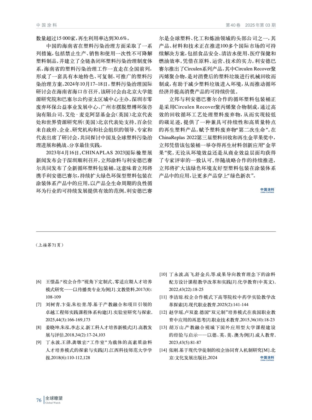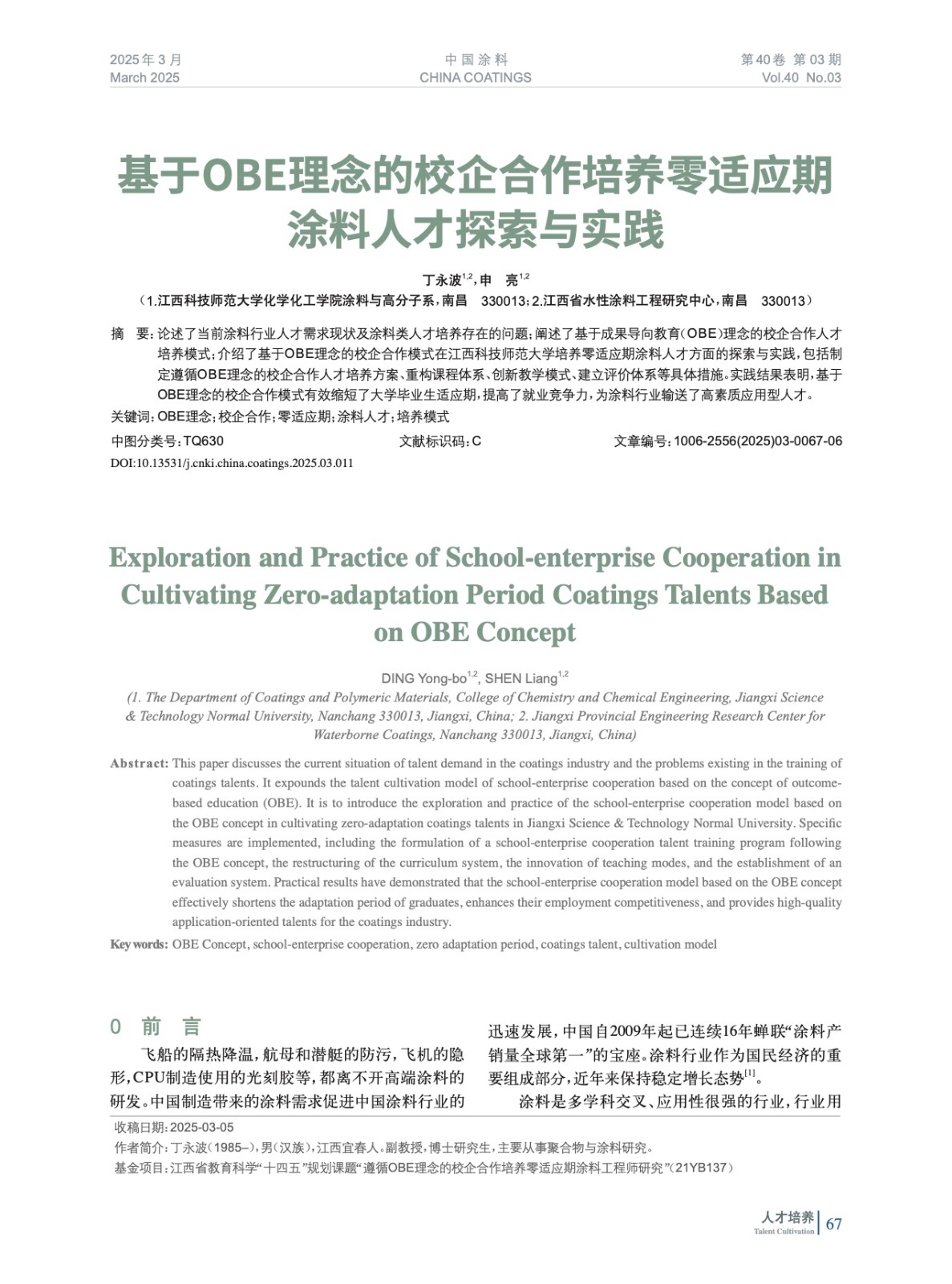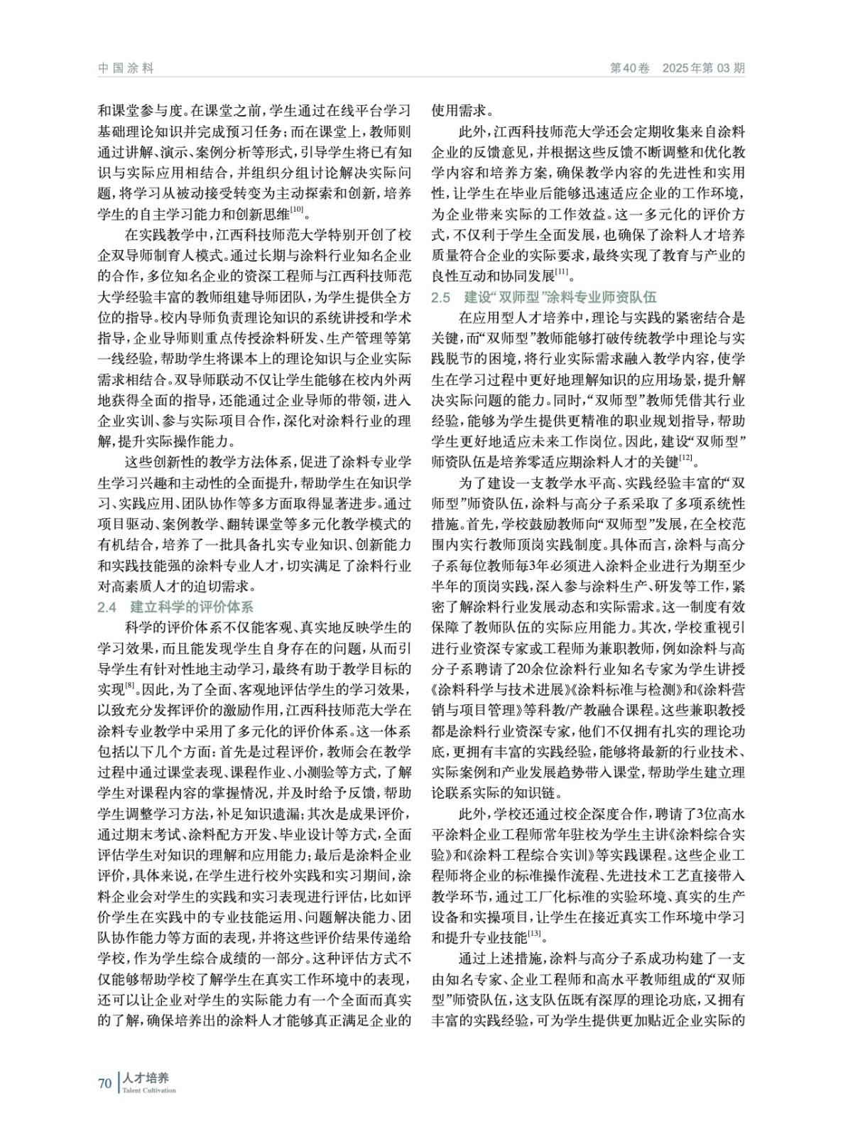 摘要:論述了當前涂料行業人才需求現狀及涂料類人才培養存在的問題;闡述了基于成果導向教育(OBE)理念的校企合作人才培養模式;介紹了基于OBE理念的校企合作模式在江西科技師范大學培養零適應期涂料人才方面的探索與實踐,包括制定遵循OBE理念的校企合作人才培養方案、重構課程體系、創新教學模式、建立評價體系等具體措施。實踐結果表明,基于OBE理念的校企合作模式有效縮短了大學畢業生適應期,提高了就業競爭力,為涂料行業輸送了高素質應用型人才。