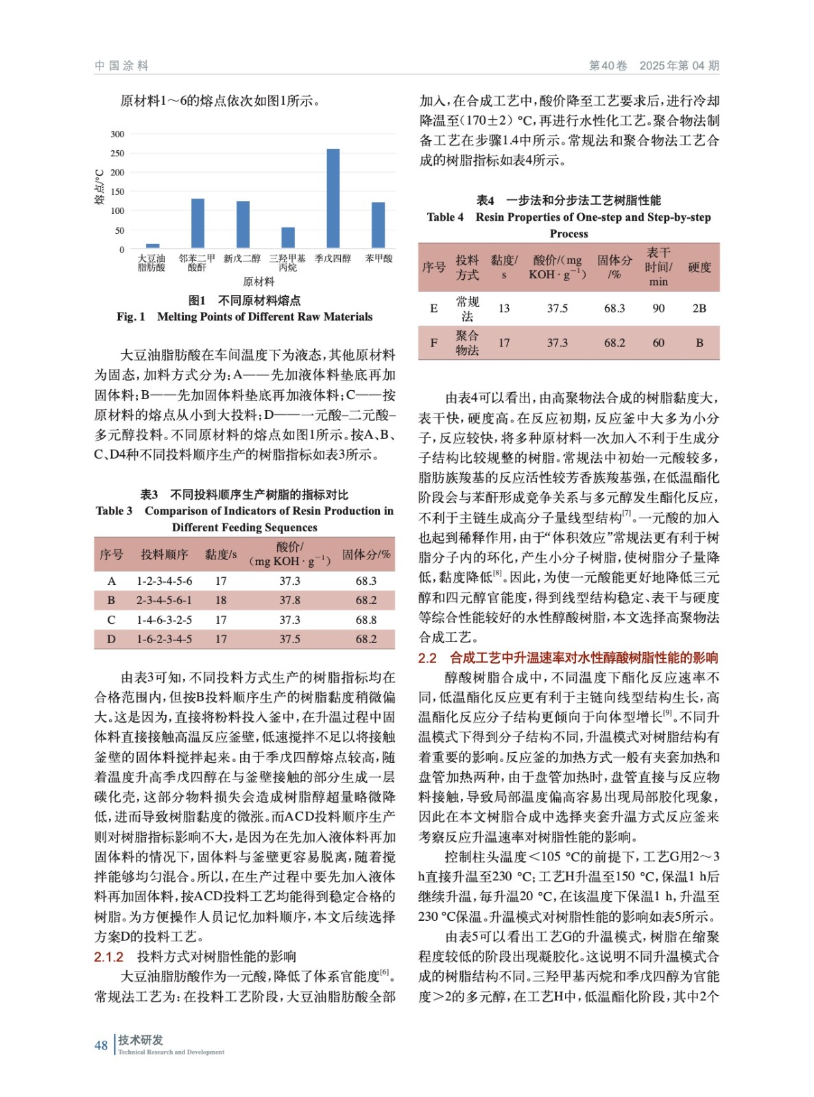 摘要:以大豆油脂肪酸、苯酐、苯甲酸、多元醇和偏苯三酸酐為主要原材料制備了水性醇酸樹(shù)脂,考察了在投料階段中投料順序和投料方式、合成階段中升溫速率和水性化程度等不同工藝控制對(duì)樹(shù)脂性能的影響。主要對(duì)樹(shù)脂黏度、酸價(jià)、固體分和親水性等指標(biāo)進(jìn)行比較。結(jié)果表明:采用先投液體料再投固體粉料的加料方式、分步投料和梯度升溫的工藝,最終兌稀后酸價(jià)控制在35~45 mg KOH/g時(shí),制備的水性醇酸樹(shù)脂的綜合性能較好。