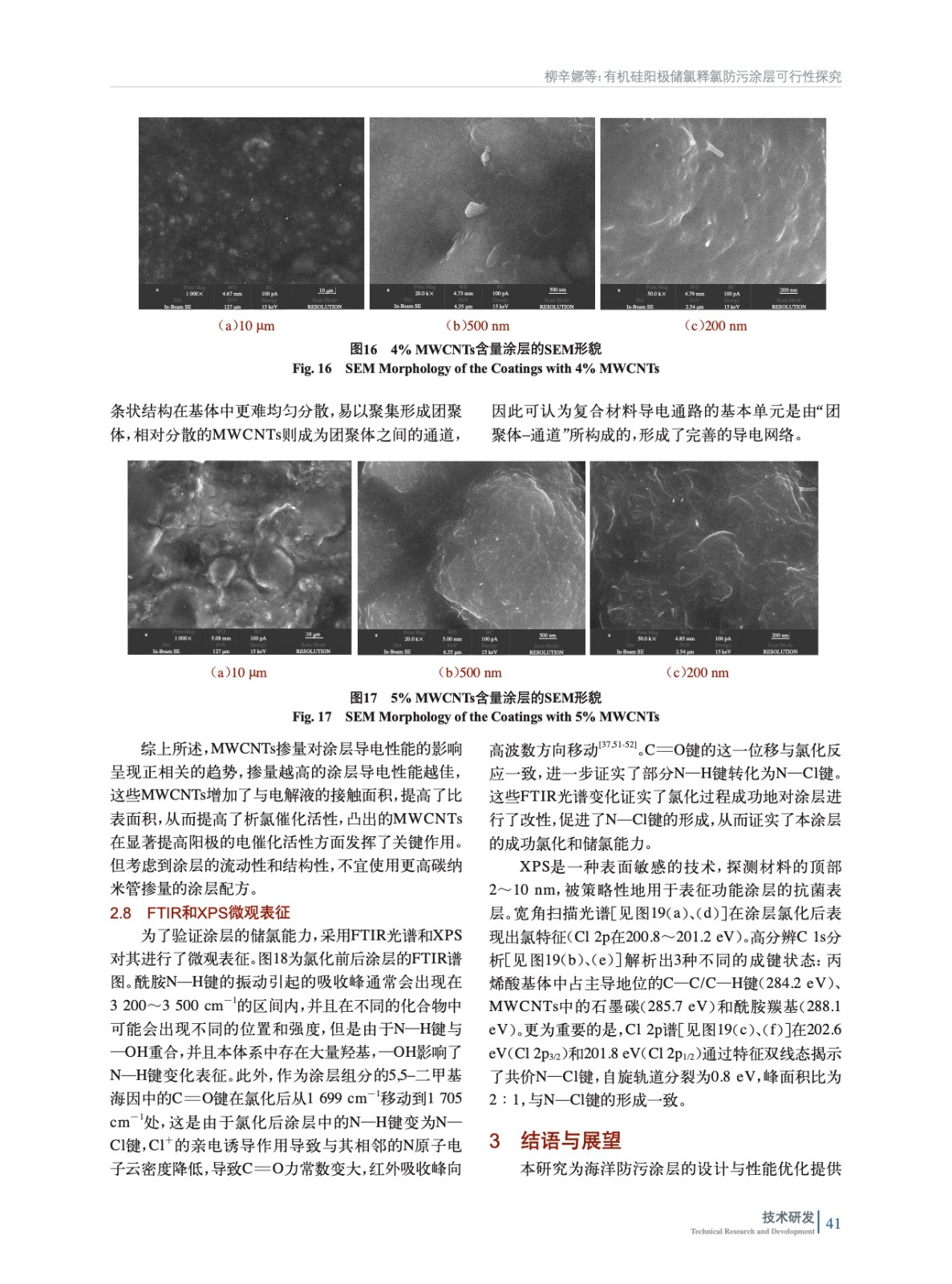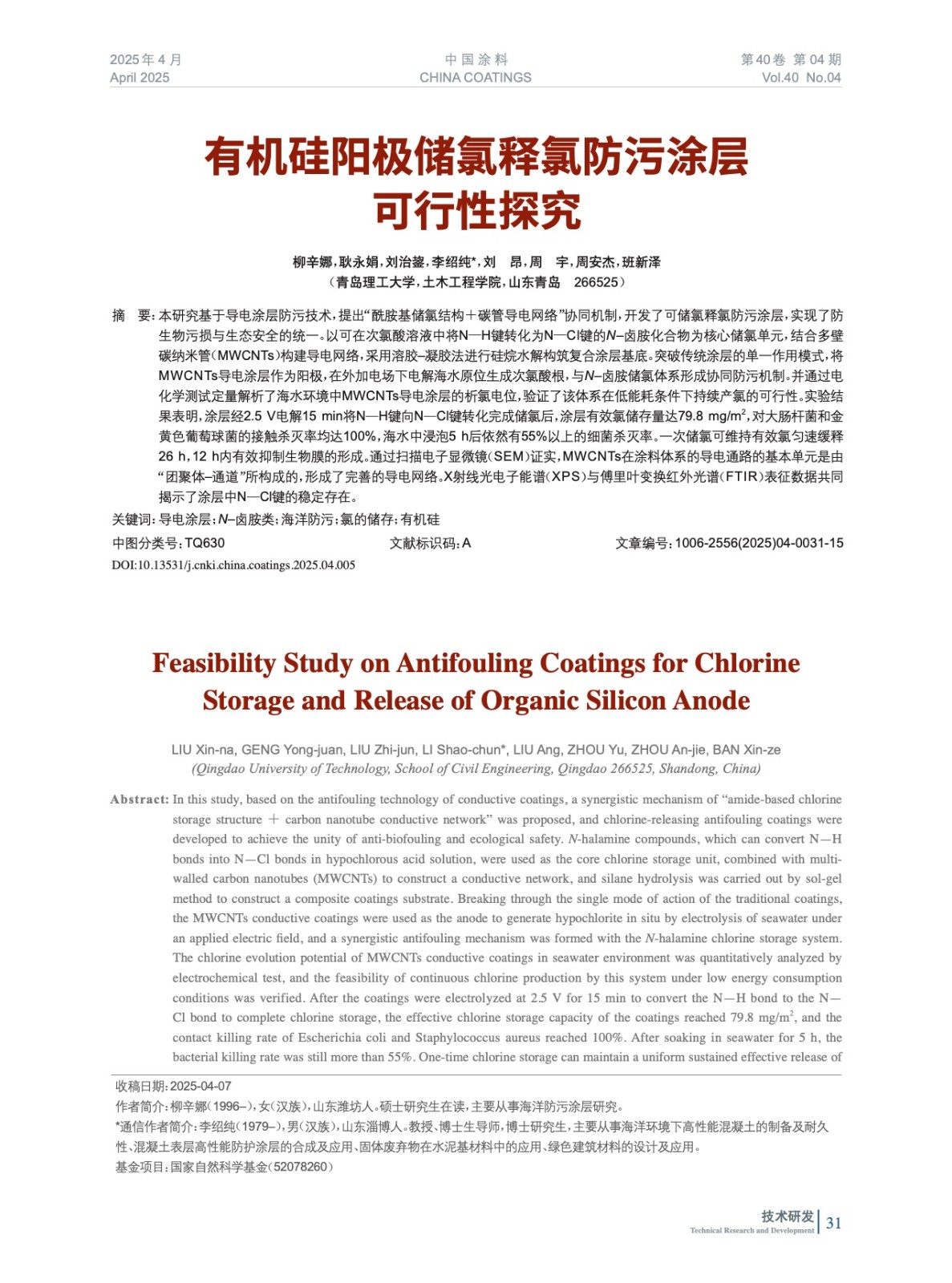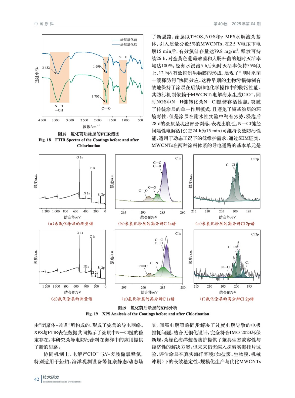 摘要:本研究基于導電涂層防污技術,提出“酰胺基儲氯結構+碳管導電網絡”協同機制,開發了可儲氯釋氯防污涂層,實現了防生物污損與生態安全的統一。以可在次氯酸溶液中將N—H鍵轉化為N—Cl鍵的N–鹵胺化合物為核心儲氯單元,結合多壁碳納米管(MWCNTs)構建導電網絡,采用溶膠–凝膠法進行硅烷水解構筑復合涂層基底。突破傳統涂層的單一作用模式,將MWCNTs導電涂層作為陽極,在外加電場下電解海水原位生成次氯酸根,與N–鹵胺儲氯體系形成協同防污機制。并通過電化學測試定量解析了海水環境中MWCNTs導電涂層的析氯電位,驗證了該體系在低能耗條件下持續產氯的可行性。實驗結果表明,涂層經2.5 V電解15 min將N—H鍵向N—Cl鍵轉化完成儲氯后,涂層有效氯儲存量達79.8 mg/m2,對大腸桿菌和金黃色葡萄球菌的接觸殺滅率均達100%,海水中浸泡5 h后依然有55%以上的細菌殺滅率。一次儲氯可維持有效氯勻速緩釋26 h,12 h內有效抑制生物膜的形成。通過掃描電子顯微鏡(SEM)證實,MWCNTs在涂料體系的導電通路的基本單元是由“團聚體–通道”所構成的,形成了完善的導電網絡。X射線光電子能譜(XPS)與傅里葉變換紅外光譜(FTIR)表征數據共同揭示了涂層中N—Cl鍵的穩定存在。