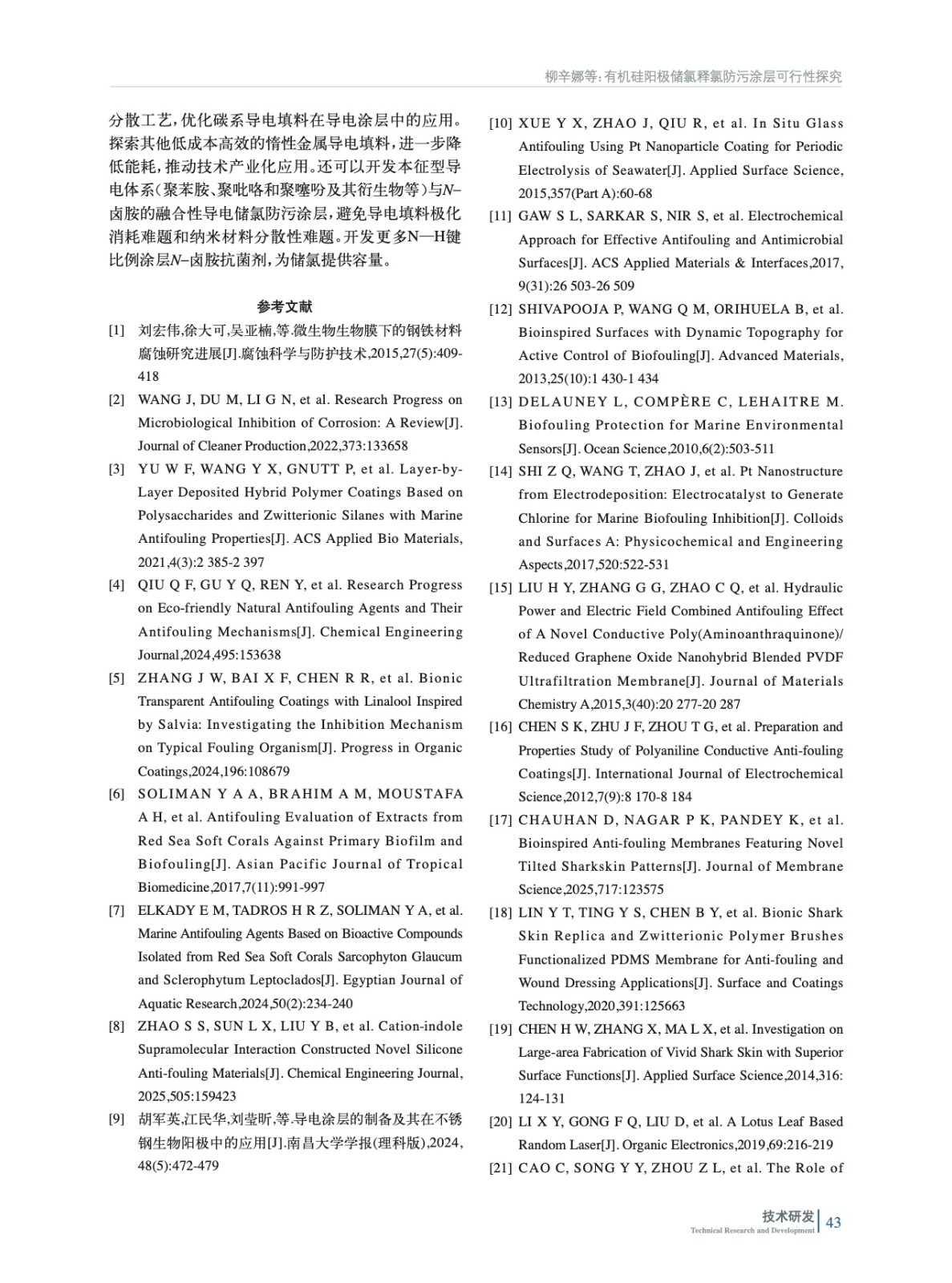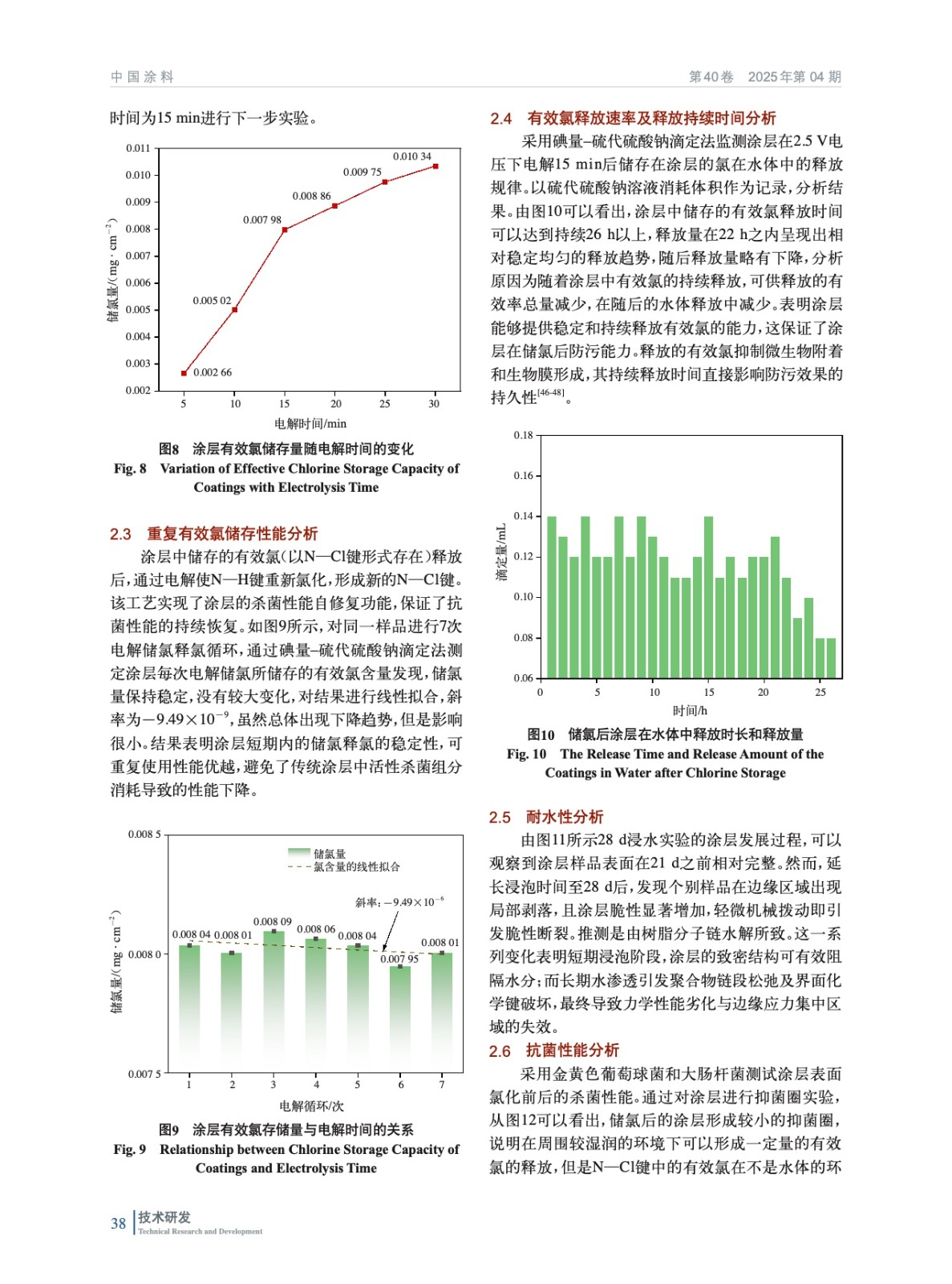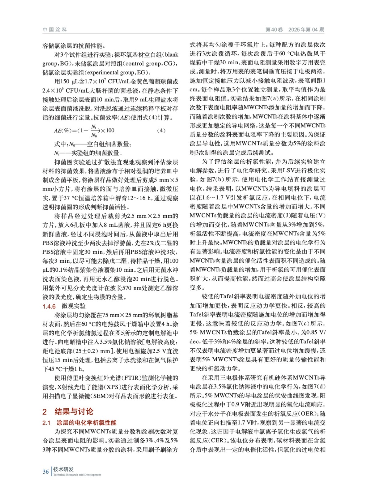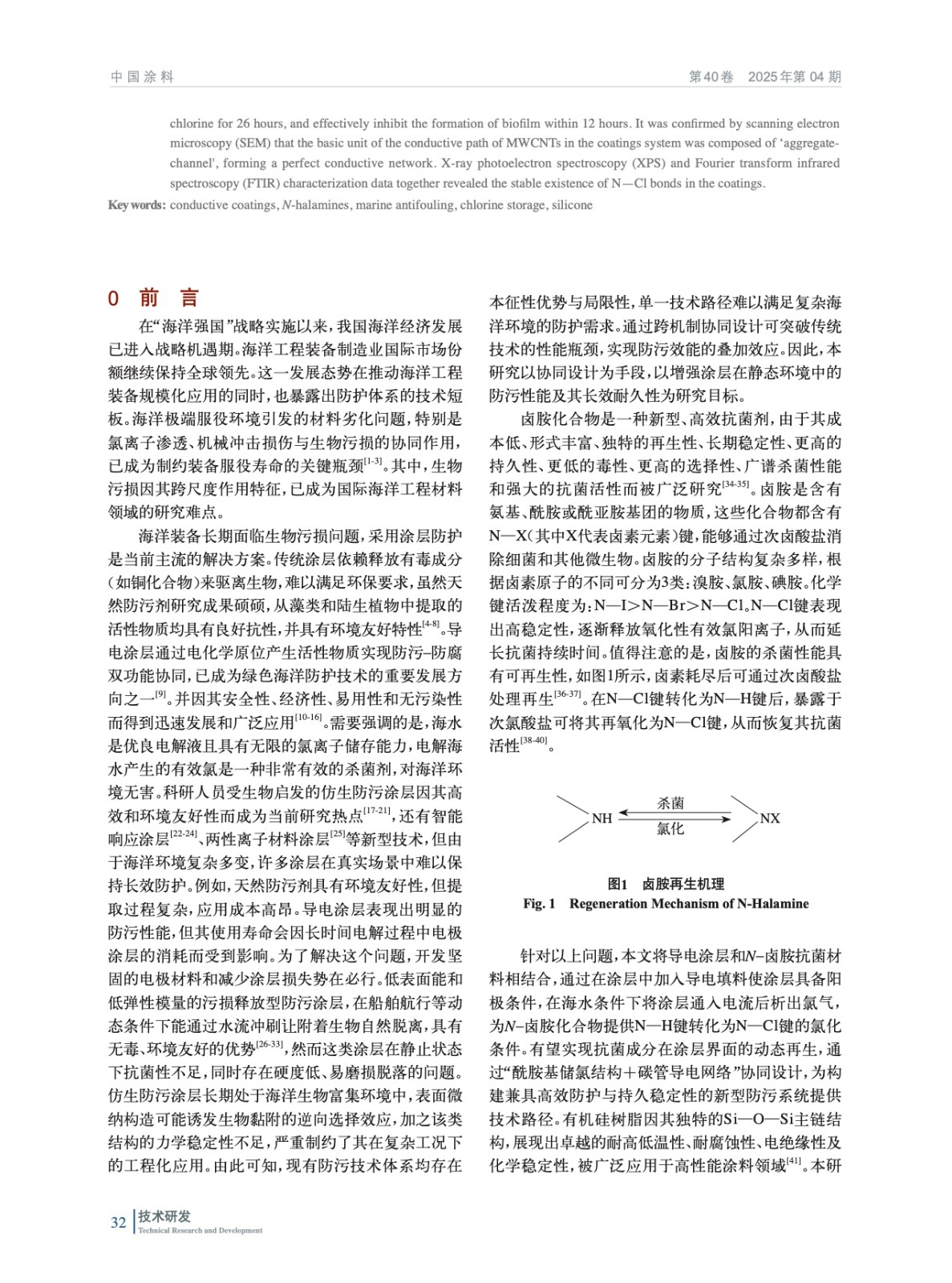 摘要:本研究基于導電涂層防污技術,提出“酰胺基儲氯結構+碳管導電網絡”協同機制,開發了可儲氯釋氯防污涂層,實現了防生物污損與生態安全的統一。以可在次氯酸溶液中將N—H鍵轉化為N—Cl鍵的N–鹵胺化合物為核心儲氯單元,結合多壁碳納米管(MWCNTs)構建導電網絡,采用溶膠–凝膠法進行硅烷水解構筑復合涂層基底。突破傳統涂層的單一作用模式,將MWCNTs導電涂層作為陽極,在外加電場下電解海水原位生成次氯酸根,與N–鹵胺儲氯體系形成協同防污機制。并通過電化學測試定量解析了海水環境中MWCNTs導電涂層的析氯電位,驗證了該體系在低能耗條件下持續產氯的可行性。實驗結果表明,涂層經2.5 V電解15 min將N—H鍵向N—Cl鍵轉化完成儲氯后,涂層有效氯儲存量達79.8 mg/m2,對大腸桿菌和金黃色葡萄球菌的接觸殺滅率均達100%,海水中浸泡5 h后依然有55%以上的細菌殺滅率。一次儲氯可維持有效氯勻速緩釋26 h,12 h內有效抑制生物膜的形成。通過掃描電子顯微鏡(SEM)證實,MWCNTs在涂料體系的導電通路的基本單元是由“團聚體–通道”所構成的,形成了完善的導電網絡。X射線光電子能譜(XPS)與傅里葉變換紅外光譜(FTIR)表征數據共同揭示了涂層中N—Cl鍵的穩定存在。