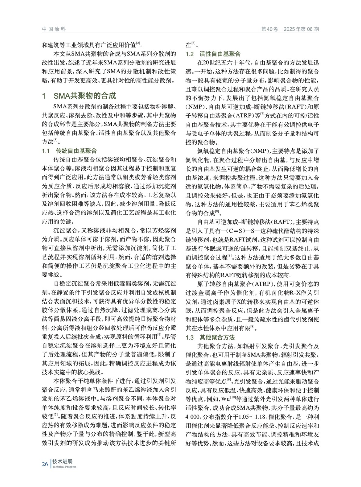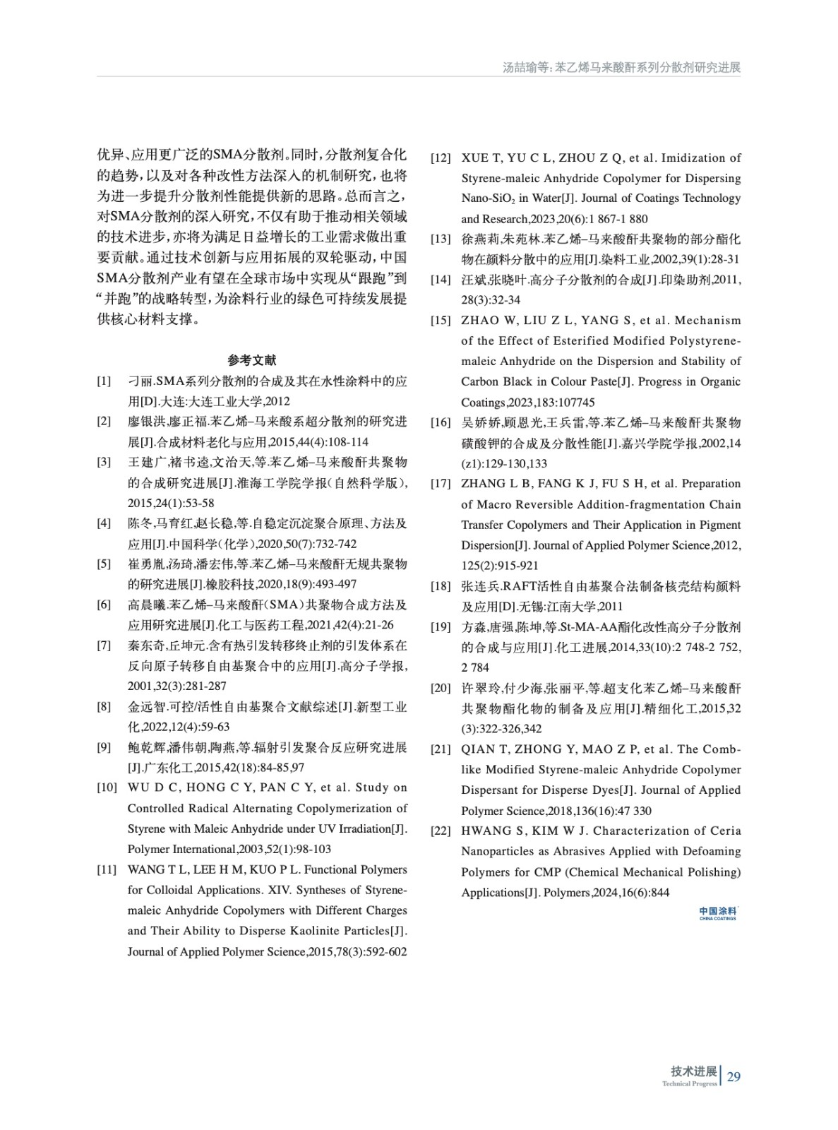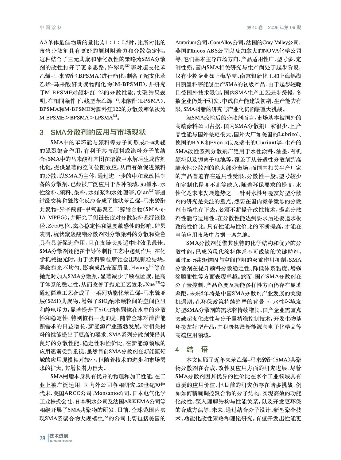 介紹了苯乙烯馬來酸酐(SMA)共聚物的常用合成方法以及配制分散劑時的不同改性策略,對比了各種方法的優缺點,旨在為優異分散劑的生產提供理論參考。另外還分析了SMA系列分散劑的應用領域與市場背景,并對未來的發展提出了展望。
