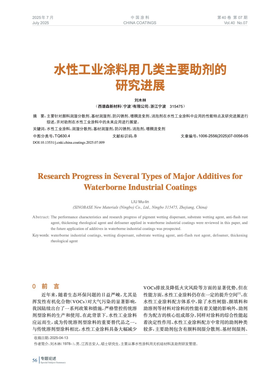 水性工業(yè)涂料用幾類主要助劑的研究進(jìn)展