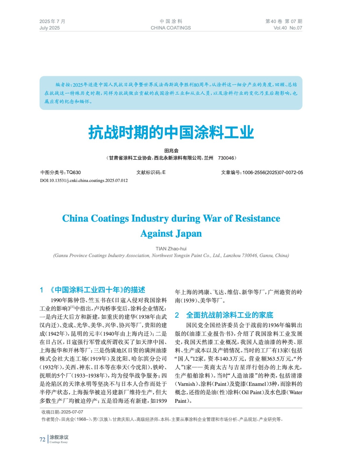 摘要:2025年適逢中國(guó)人民抗日戰(zhàn)爭(zhēng)暨世界反法西斯戰(zhàn)爭(zhēng)勝利80周年,從涂料這一細(xì)分產(chǎn)業(yè)的角度,回顧、總結(jié)在抗戰(zhàn)這一特殊歷史時(shí)期,同樣為抗戰(zhàn)做出貢獻(xiàn)的我國(guó)涂料工業(yè)和從業(yè)人員,以及涂料行業(yè)的變化乃至后期影響,也屬應(yīng)有的紀(jì)念和緬懷。