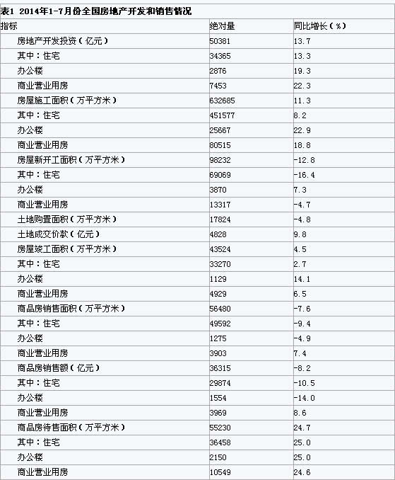 2014年1-7月份,全國房地產開發投資50381億元,同比名義增長13.7%,增速比1-6月份回落0.4個百分點。其中,住宅投資34365億元,增長13.3%,增速回落0.4個百分點,占房地產開發投資的比重為68.2%。