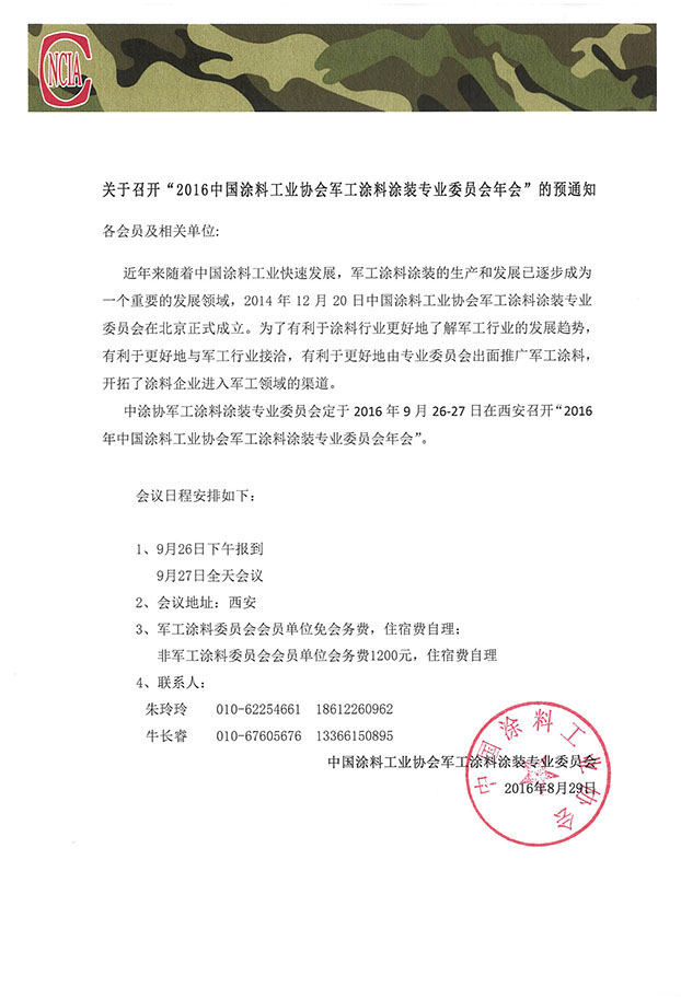 關于召開“2016中國涂料工業協會軍工涂料涂裝專業委員會年會”的預通知