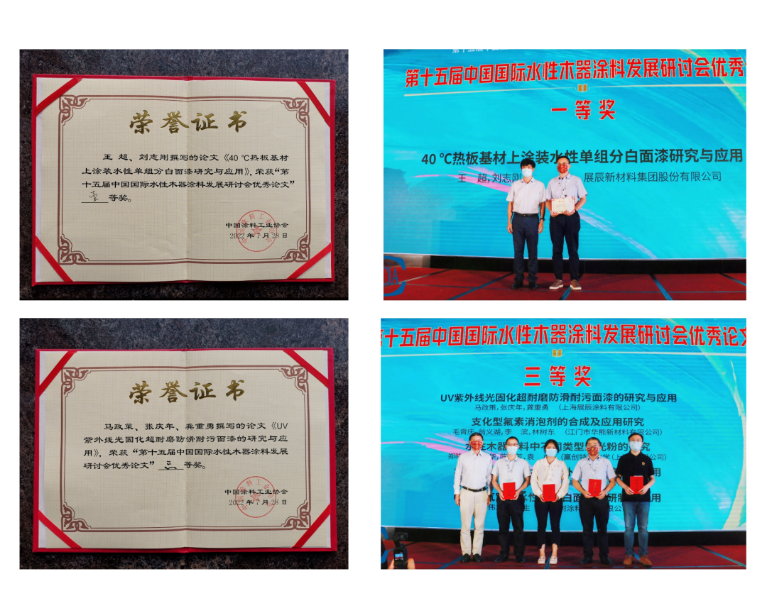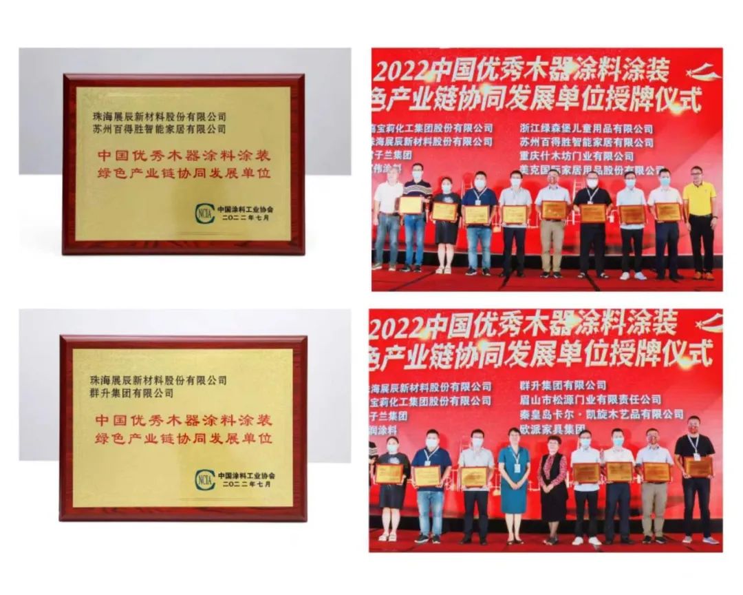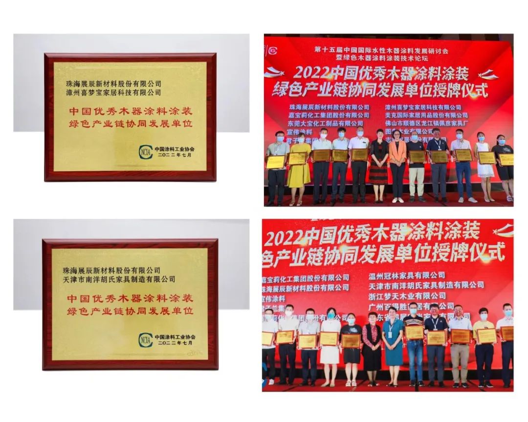 展辰新材與海太歐林、南洋胡氏家具、群升集團、百得勝智能家居、喜夢寶家居、瑪格家居一起,被評為“2022中國優秀木器涂料涂裝綠色產業鏈協同發展單位”。