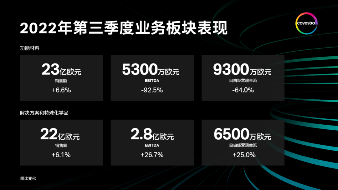 在匯率波動(dòng)和銷售價(jià)格水平上漲的背景下,第三季度功能材料業(yè)務(wù)板塊銷售額同比增長6.6%至23億歐元。相反,因需求下滑導(dǎo)致的產(chǎn)品總銷量下降帶來了負(fù)面影響。該板塊EBITDA下降92.5%至5300萬歐元。這主要?dú)w因于利潤率的下降,因?yàn)殇N售價(jià)格水平提高只能在很小程度上抵消原材料和能源價(jià)格的上漲。特別受EBITDA下降影響,功能材料業(yè)務(wù)板塊自由經(jīng)營現(xiàn)金流減少64%至9300萬歐元。