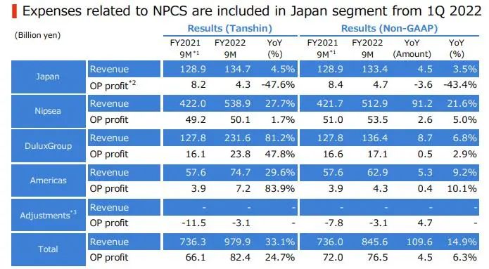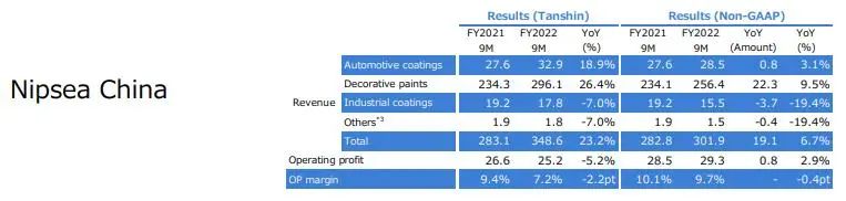 前三季度由于半導體芯片短缺和其他因素導致汽車生產數量下降,導致日本本土的汽車涂料銷售收入下降。受新建住宅開工穩定和其他有利市場條件的推動,工業涂料收入增加。由于市場條件的改善,裝飾涂料收入也有所增加。