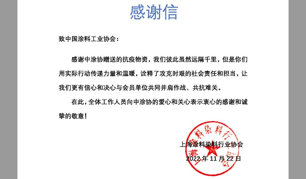上海涂料染料行業協會感謝信