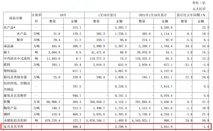 海關總署發布《2022年10月全國出口重點商品量值表》,公告顯示1-10月家具及其零件出口額3798.9億元,同比下滑-1.4%,其中10月出口額400.4億元。