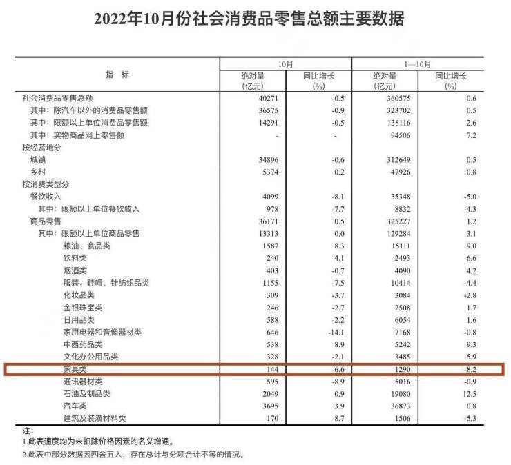 2022年10月份家具類零售總額144億元同比下降6.6%。1-10月家具類零售總額1290億元,同比下降8.2%。
