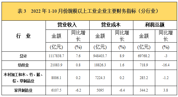 2022年1-10月全國家具制造業營業收入為6107.5億元,同比下降6.2%;營業成本5095億元,同比下降6.4%;利潤總額344.2億元,同比增長3.8%。