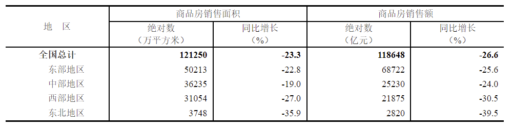 1—11月份,商品房銷售面積121250萬平方米,同比下降23.3%,其中住宅銷售面積下降26.2%。商品房銷售額118648億元,下降26.6%,其中住宅銷售額下降28.4%。